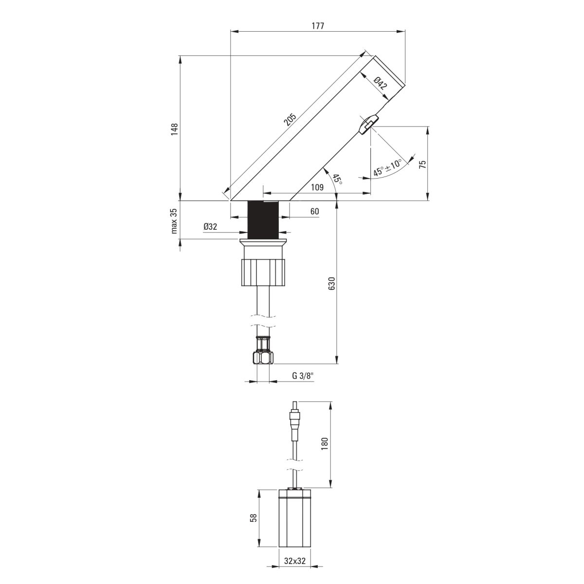 Filet de conexiune M8 și filet de instalare 3/8'', cu tipul filetului extern.