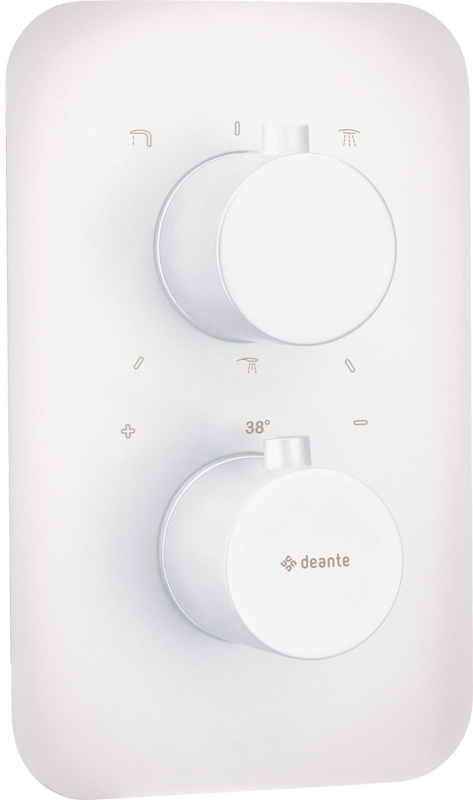Capacul Deante Therm este un element exterior pentru bateriile de cadă cu termostat, cu un finisaj alb mat și instalare ascunsă. Fabricat din alamă, este conceput pentru a adăuga un aspect elegant și minimalist băii.