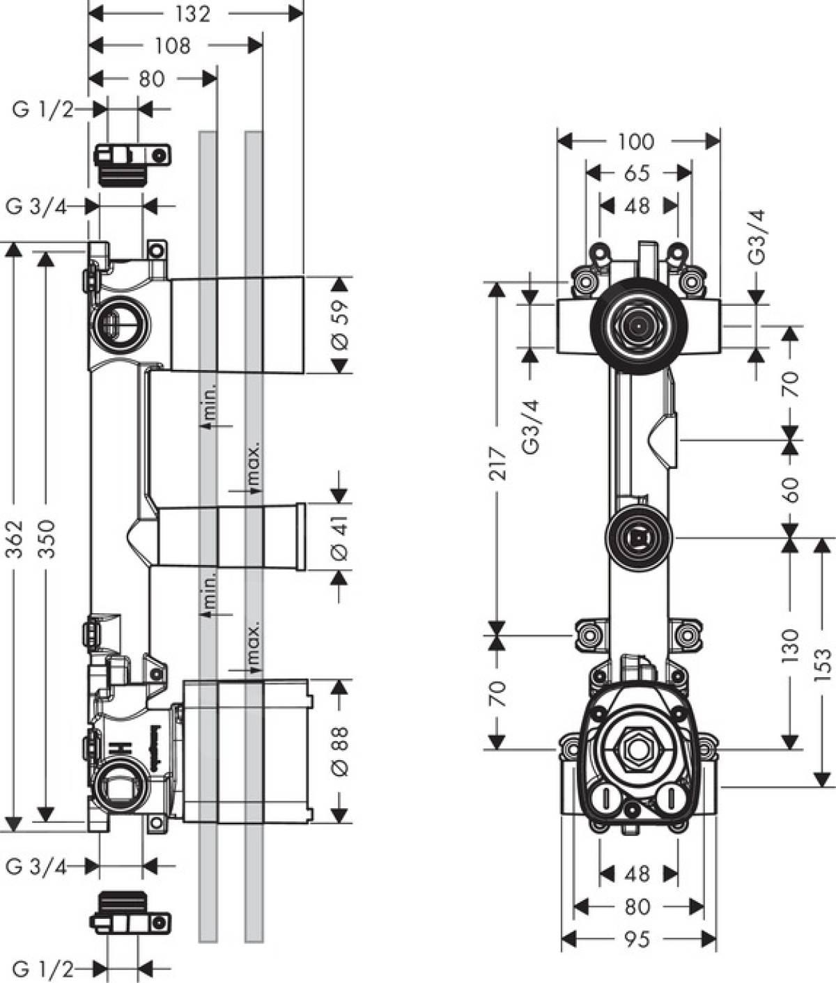 Corpul de bază Axor este conceput pentru instalații termostatate ascunse, compatibil cu modulele termostatice ce oferă 2 funcții (ex. cap de duș și para de mână). Poate fi montat orizontal sau vertical și este partea centrală în sistem, oferind conexiuni fiabile și poziționare precisă a elementelor vizibile.