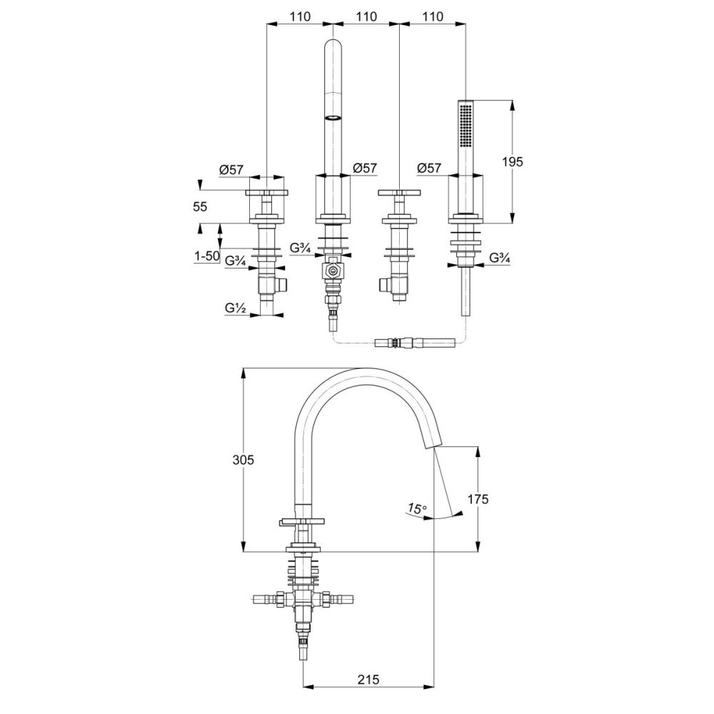 • Baterie cadă-duş DN 15