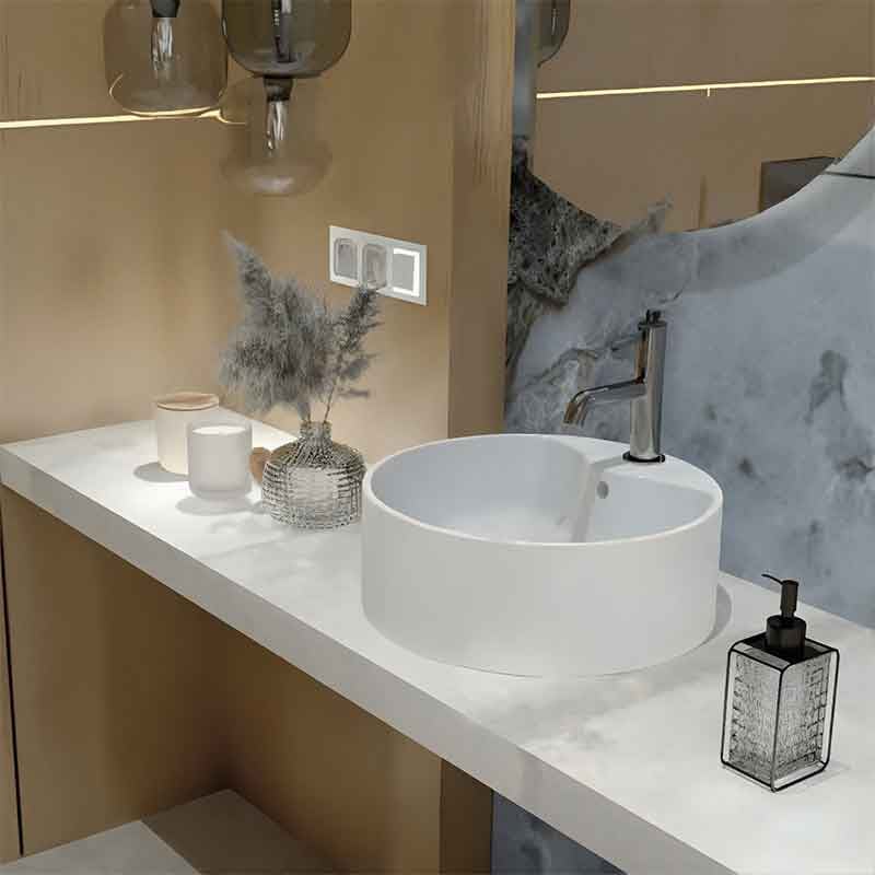 Montajul pe lavoar (cu orificiu dedicat) permite instalarea rapidă și integrarea armonioasă în mobilierul de baie.