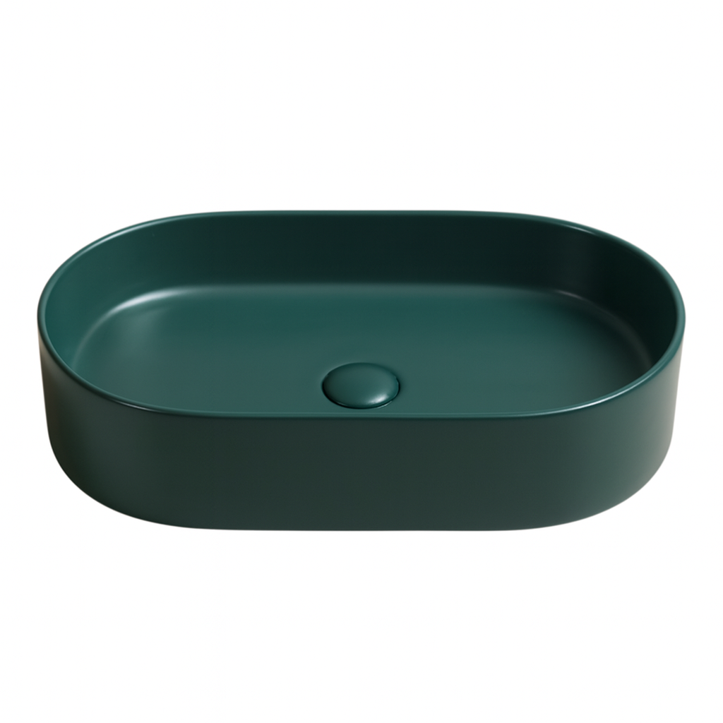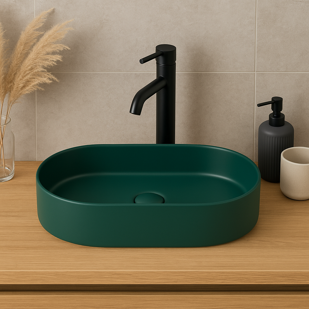 Transformă baia ta într-un spațiu sofisticat și modern cu lavoarul pe blat Foglia Adelais, finisat în verde închis mat. Fabricat din ceramică premium și tratat pentru o rezistență deosebită la zgârieturi, acest lavoar oval este perfect pentru amenajările contemporane.