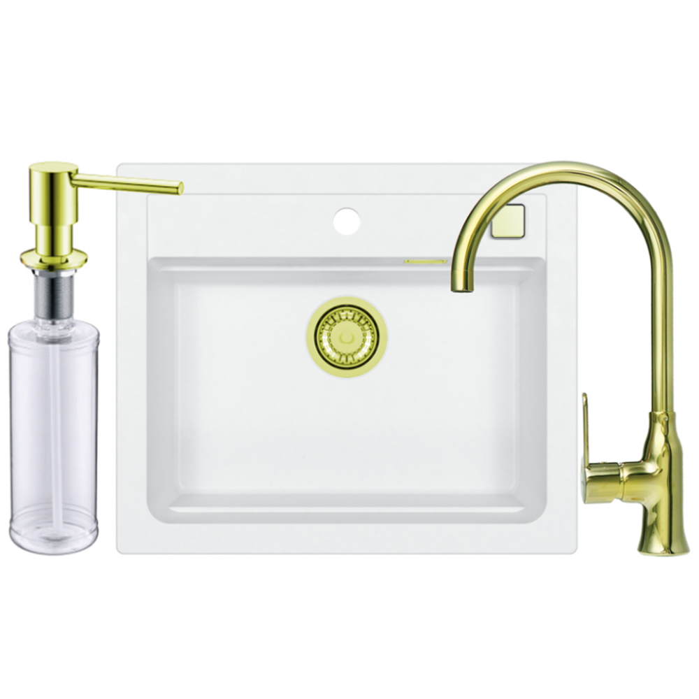 Pachetul contine chiuveta bucatarie compozit Alveus Atrox 30 alba, baterie bucatarie aurie Alveus Lola Monarch, sifon auriu si dozator sapun lichid auriu.