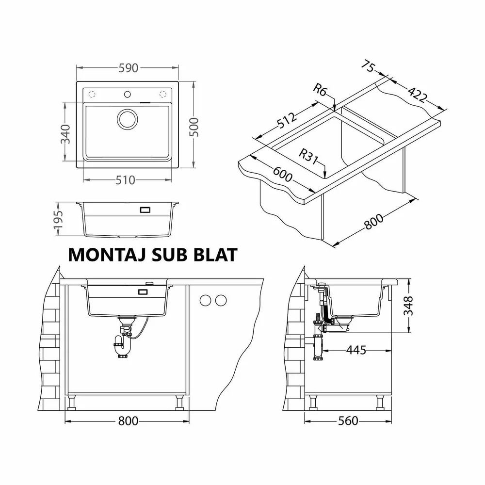 Descriere set chiuveta bucatarie compozit Atrox 30 alba, baterie auriu lucios, sifon si dozator Alveus