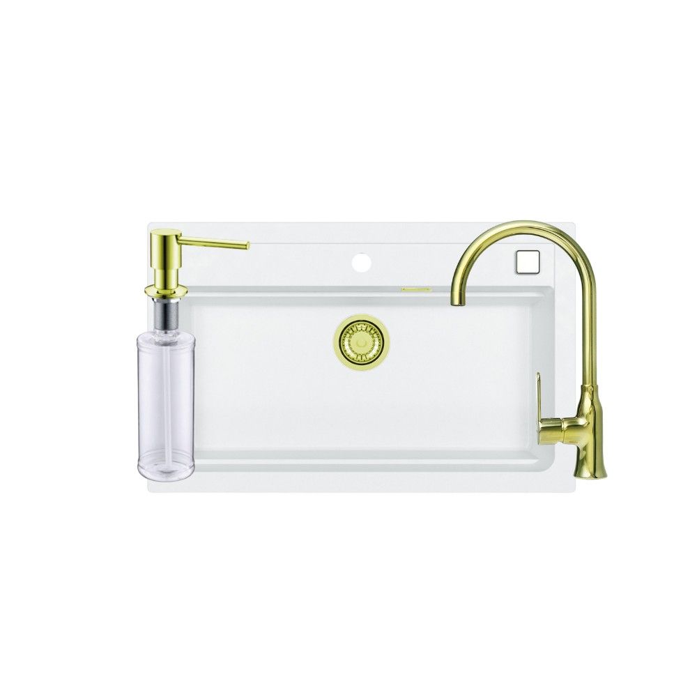 Alveus Set chiuveta bucatarie compozit Atrox 40 alba, baterie auriu lucios, sifon si dozator Alveus
