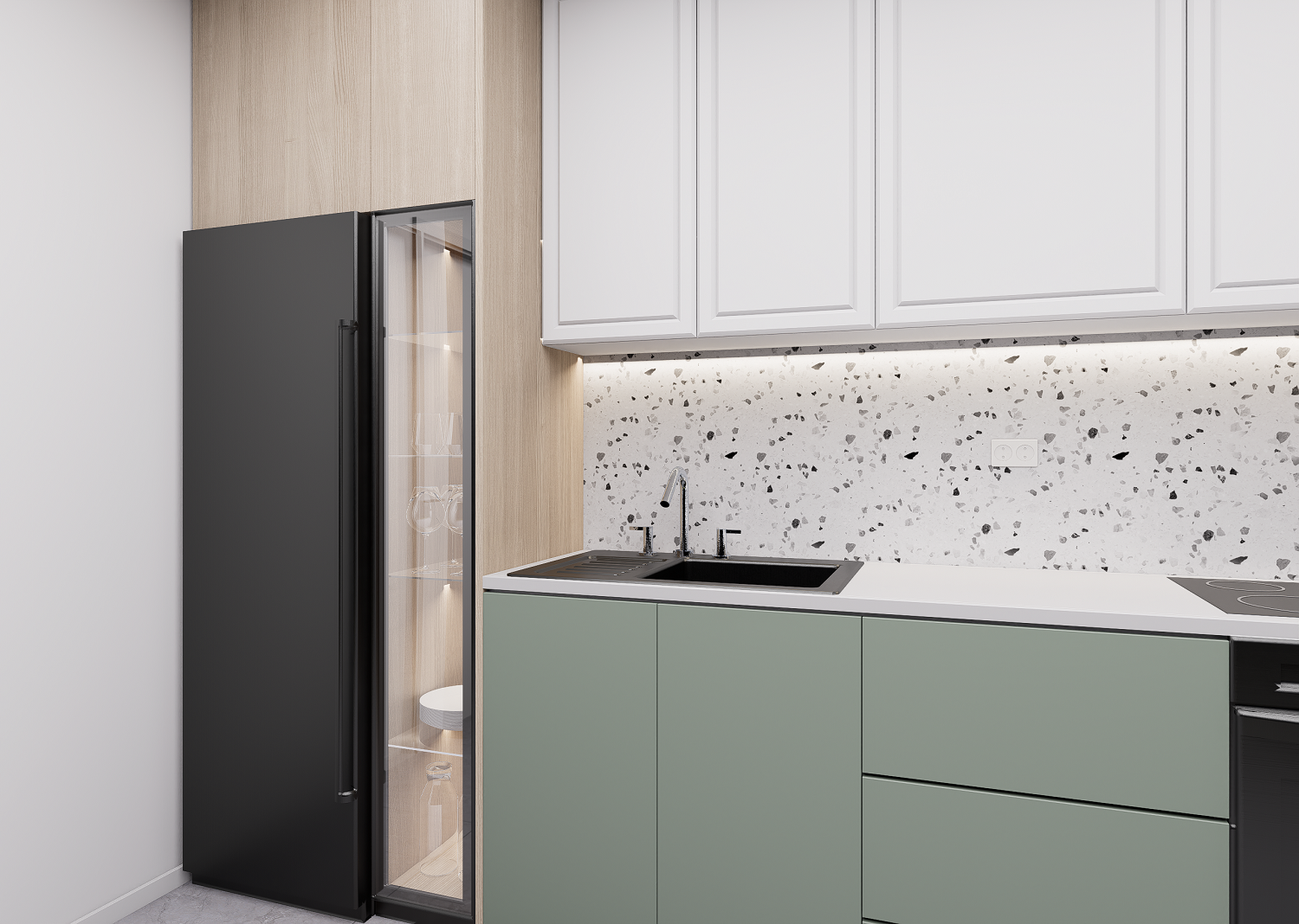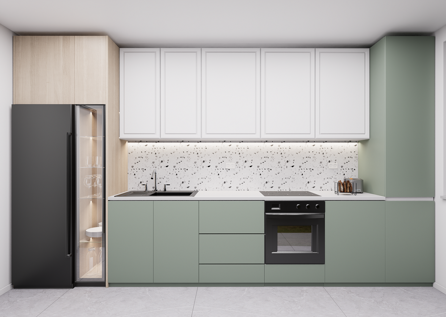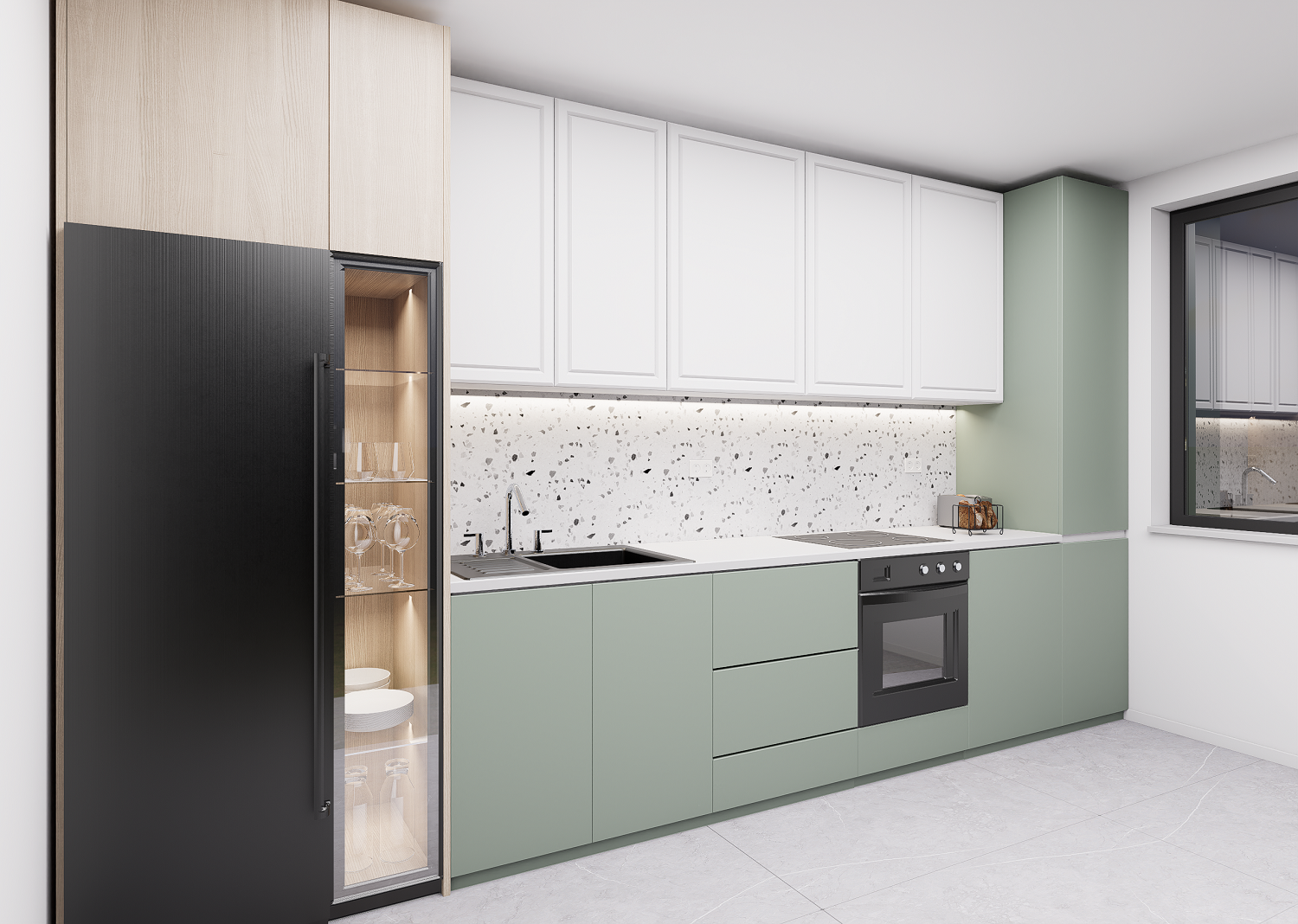 Aria imbina designul scandinav cu functionalitatea moderna. Fronturile mate si accentele din lemn deschis aduc o atmosfera calda si primitoare in orice locuinta.