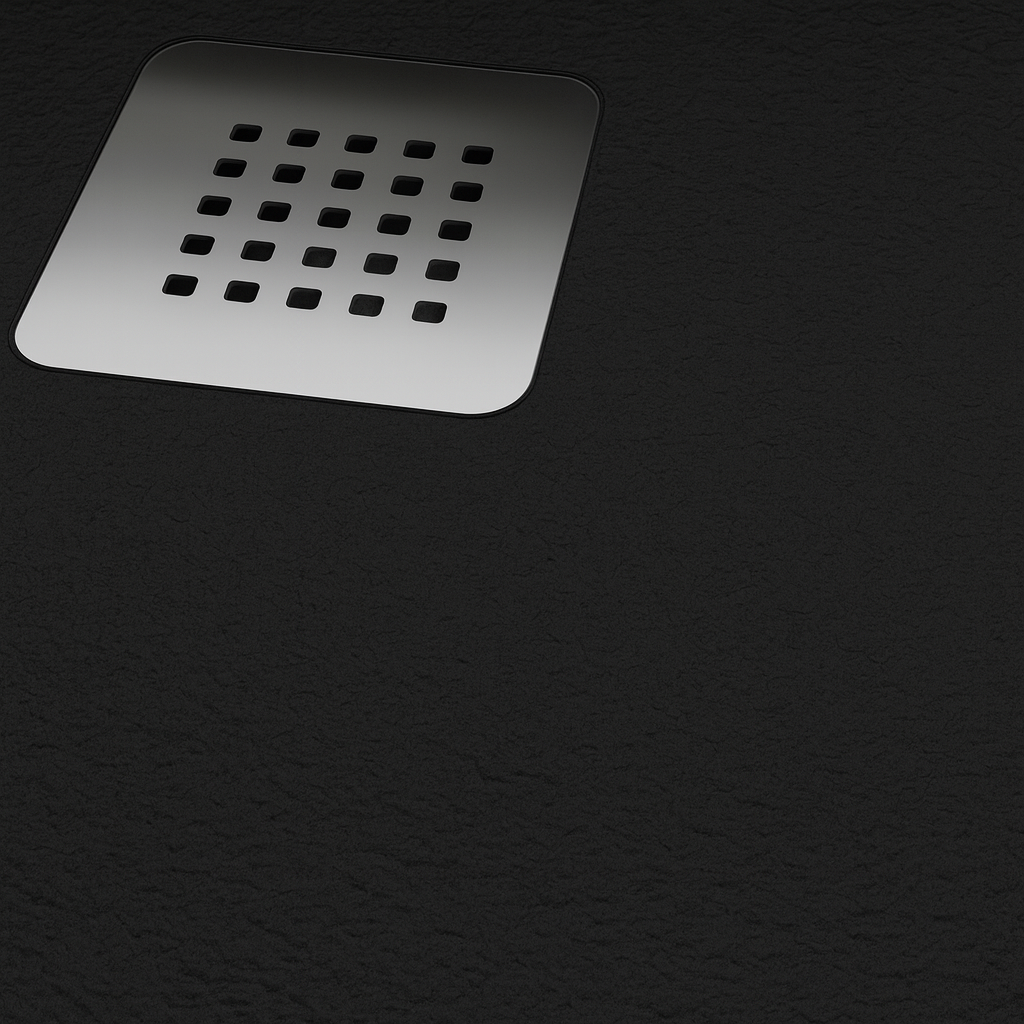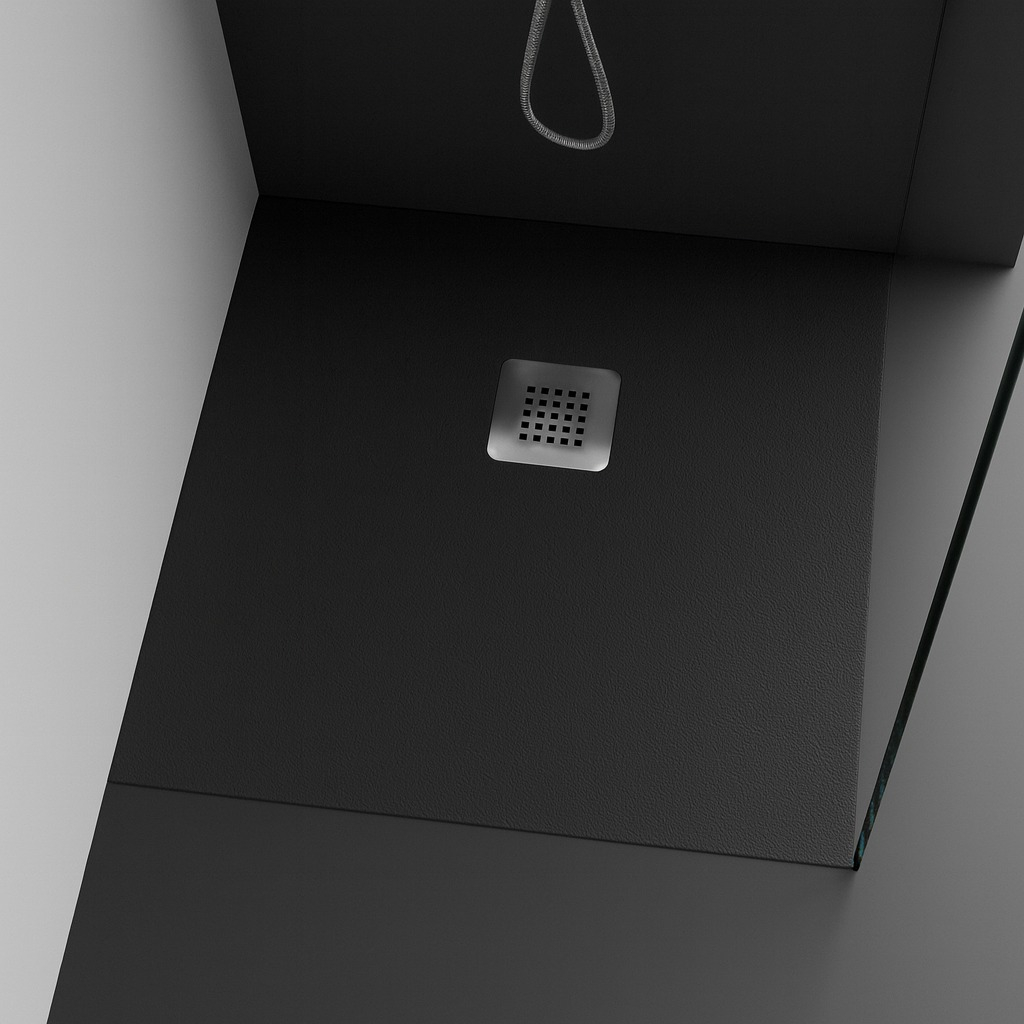 Cădiță de duș pătrată Foglia Shape, din compozit (Cast Marble), culoare negru mat, cu dimensiuni de 80x80 cm. Design ultra-slim, ideală pentru montaj la nivelul pardoselii. Rezistentă la uzură. Sifonul nu este inclus (diametru recomandat 90 mm).