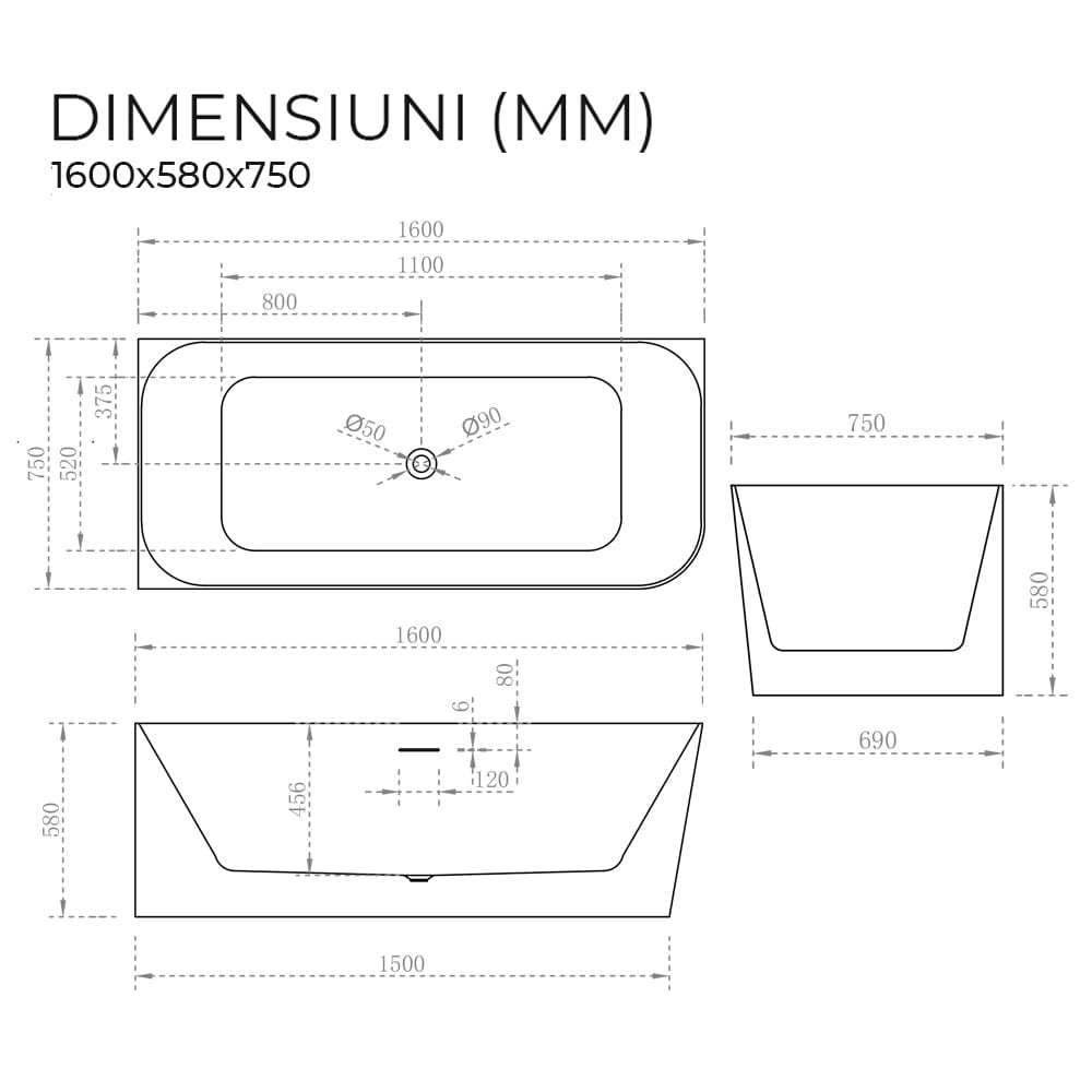 Dimensiuni generoase pentru confort optim: Cu dimensiunile de 160x75x58 cm, această cadă oferă un spațiu suficient de relaxare, fiind potrivită pentru orice tip de baie.