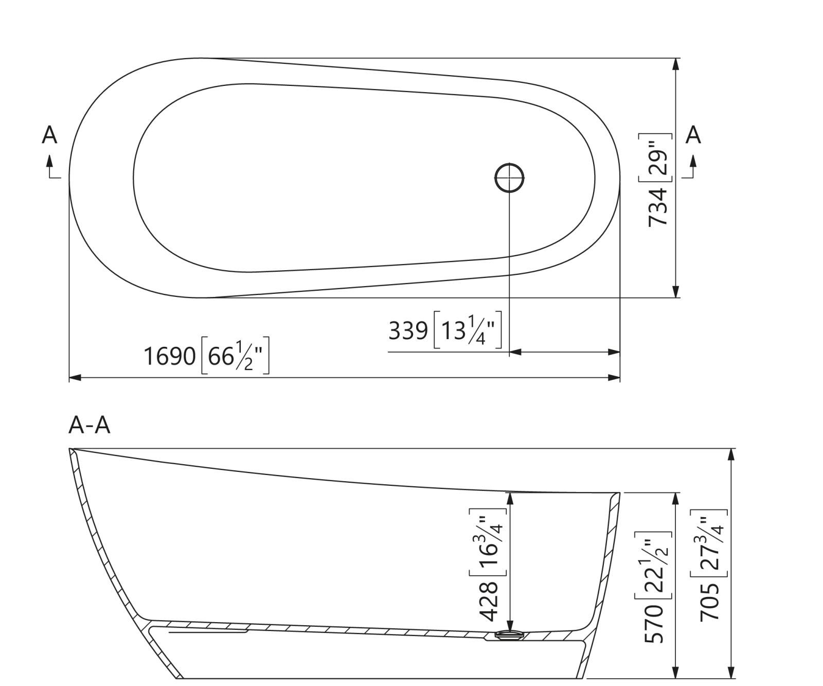 Această cada freestanding din compozit alb reprezintă o piesă de design remarcabilă, definită prin liniile sale asimetrice și profilul înalt care adaugă o notă de eleganță sculpturală oricărei băi moderne. Cu o lungime de 1687 mm și o înălțime maximă de 705 mm, cada este proiectată pentru a oferi un suport ergonomic excelent, transformând experiența îmbăierii într-un moment de relaxare absolută.