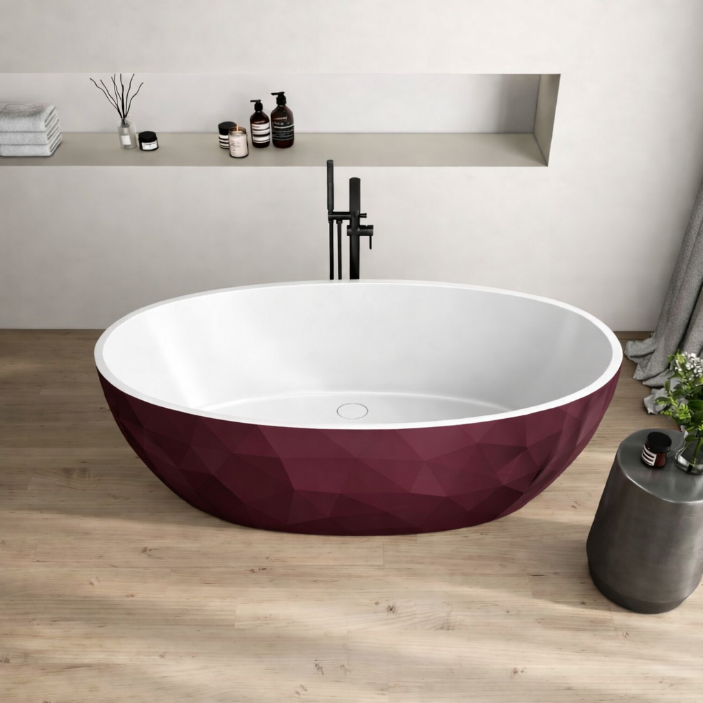 Această cadă freestanding din compozit, culoare bordo mat, dimensiuni 1670x820 mm, este alegerea ideală pentru băile moderne care pun accent pe design, confort și calitate premium. Forma ovală elegantă și suprafața geometrică transformă cada într-un element central de design, perfect pentru băi contemporane, proiecte rezidențiale premium sau spații HoReCa.