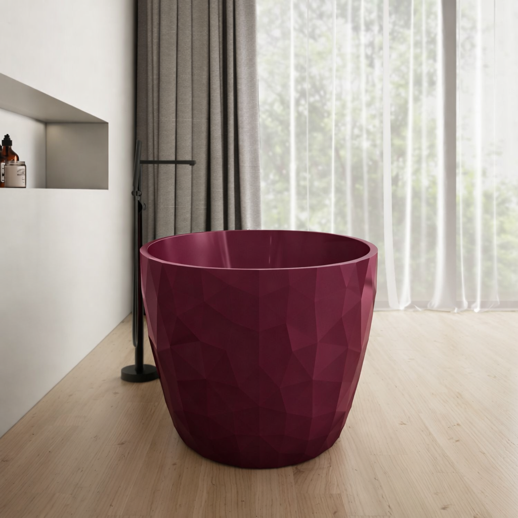Această cadă freestanding din compozit, culoare bordo mat, dimensiuni 1670x820 mm, este alegerea ideală pentru băile moderne care pun accent pe design, confort și calitate premium. Forma ovală elegantă și suprafața geometrică transformă cada într-un element central de design, perfect pentru băi contemporane, proiecte rezidențiale premium sau spații HoReCa.