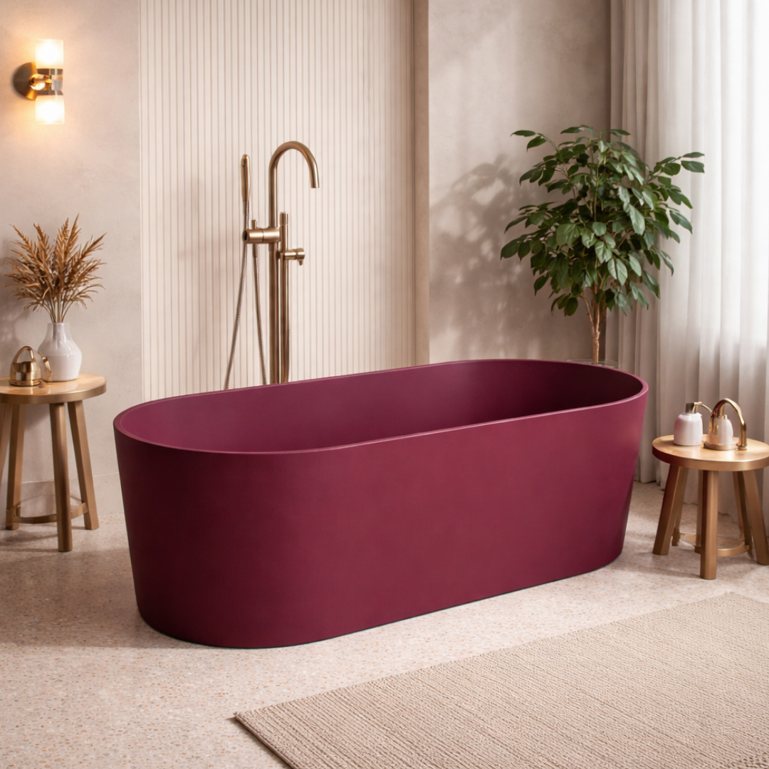 Transformă baia într-un spațiu de design autentic cu această cadă freestanding din compozit, finisată într-o nuanță profundă burgundy mat. Parte din colecția Foglia Terra, produsul redefinește ideea de relaxare printr-un echilibru perfect între estetică contemporană, material premium și confort ergonomic.