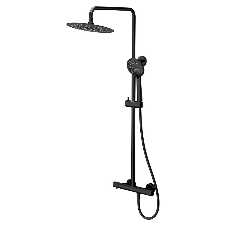 Coloană de duș elegantă cu finisaj negru, dotată cu baterie termostatată pentru control precis al temperaturii, pară fixă de ploaie și pară mobilă.