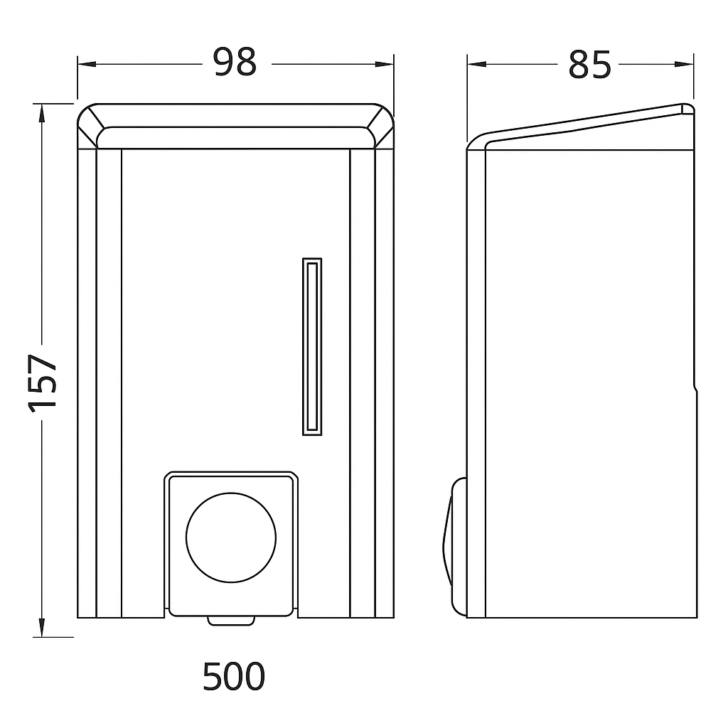 Sistemul de acționare mecanică prin apăsare permite dozarea controlată a săpunului lichid, prevenind risipa, iar vizorul frontal transparent indică nivelul de umplere.