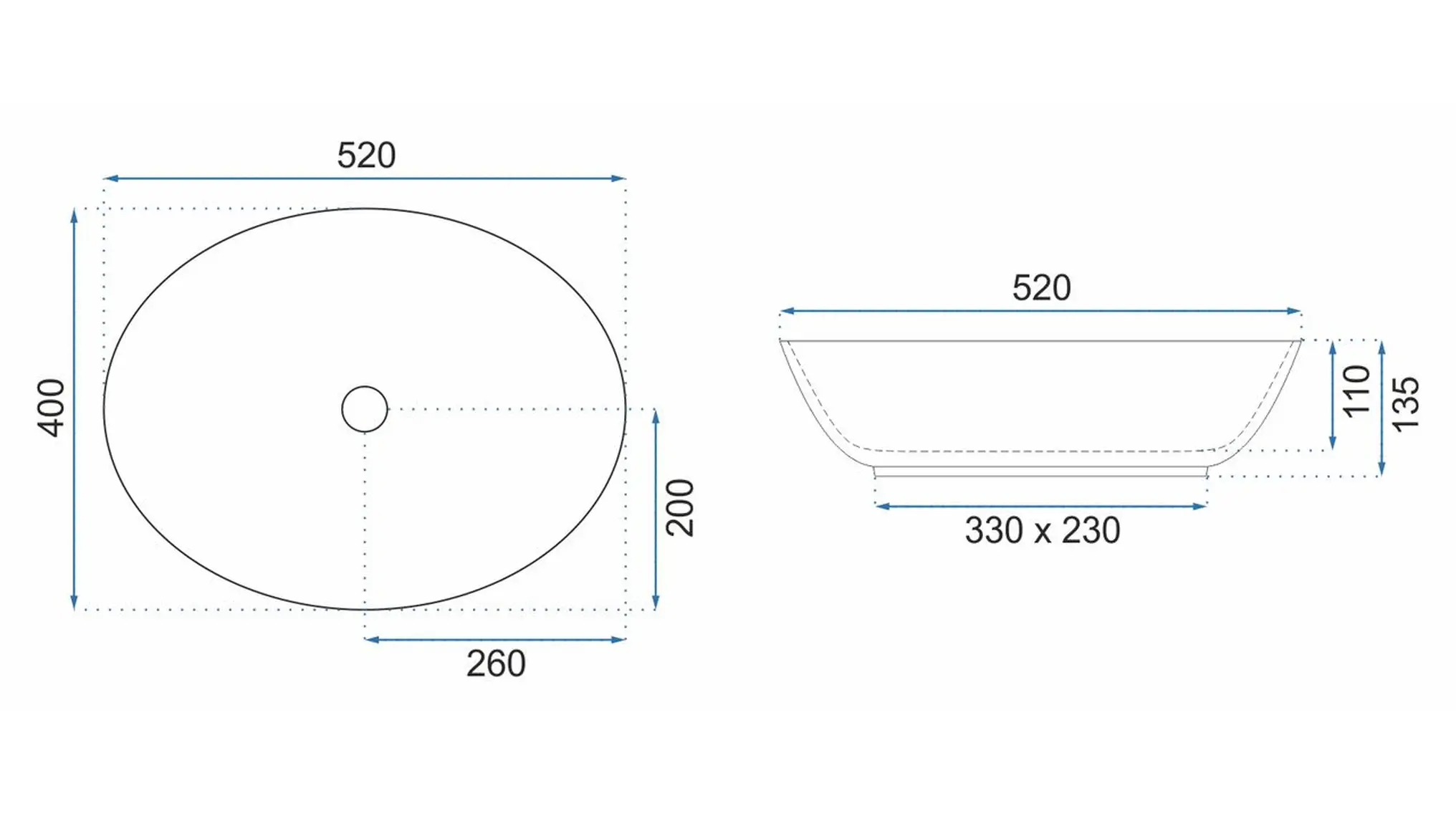 Dimensiunea de 520 mm lungime și 400 mm lățime oferă spațiu confortabil pentru utilizare zilnică, iar înălțimea de 135 mm contribuie la limitarea stropirii apei. Montajul pe blat permite integrarea în mobilier premium și oferă flexibilitate în alegerea bateriei – baterie înaltă montată pe blat sau baterie montată în perete.