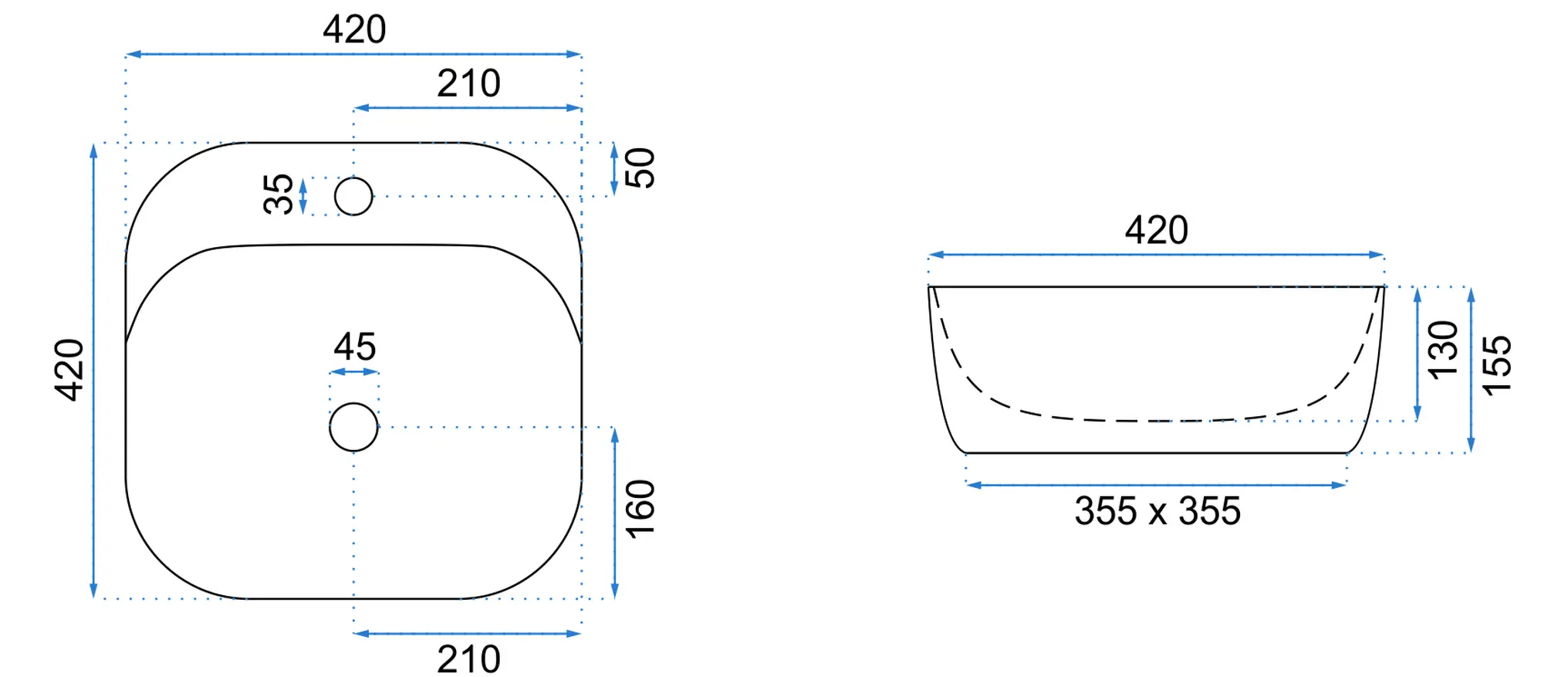 Dimensiunea de 420 x 420 mm asigură un echilibru ideal între confort și compactitate, fiind potrivit atât pentru băi rezidențiale, cât și pentru spații comerciale premium.