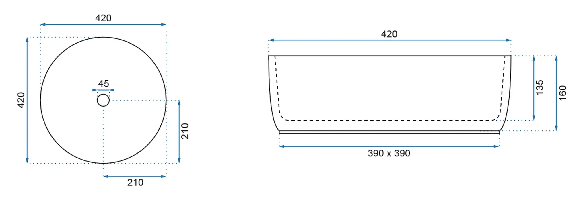 Dimensiunea de 420 mm diametru oferă spațiu confortabil pentru utilizare zilnică, iar înălțimea de 160 mm ajută la limitarea stropirii apei. Montajul pe blat permite integrarea în mobilier premium și oferă flexibilitate în alegerea bateriei: baterie înaltă montată pe blat sau baterie montată în perete.