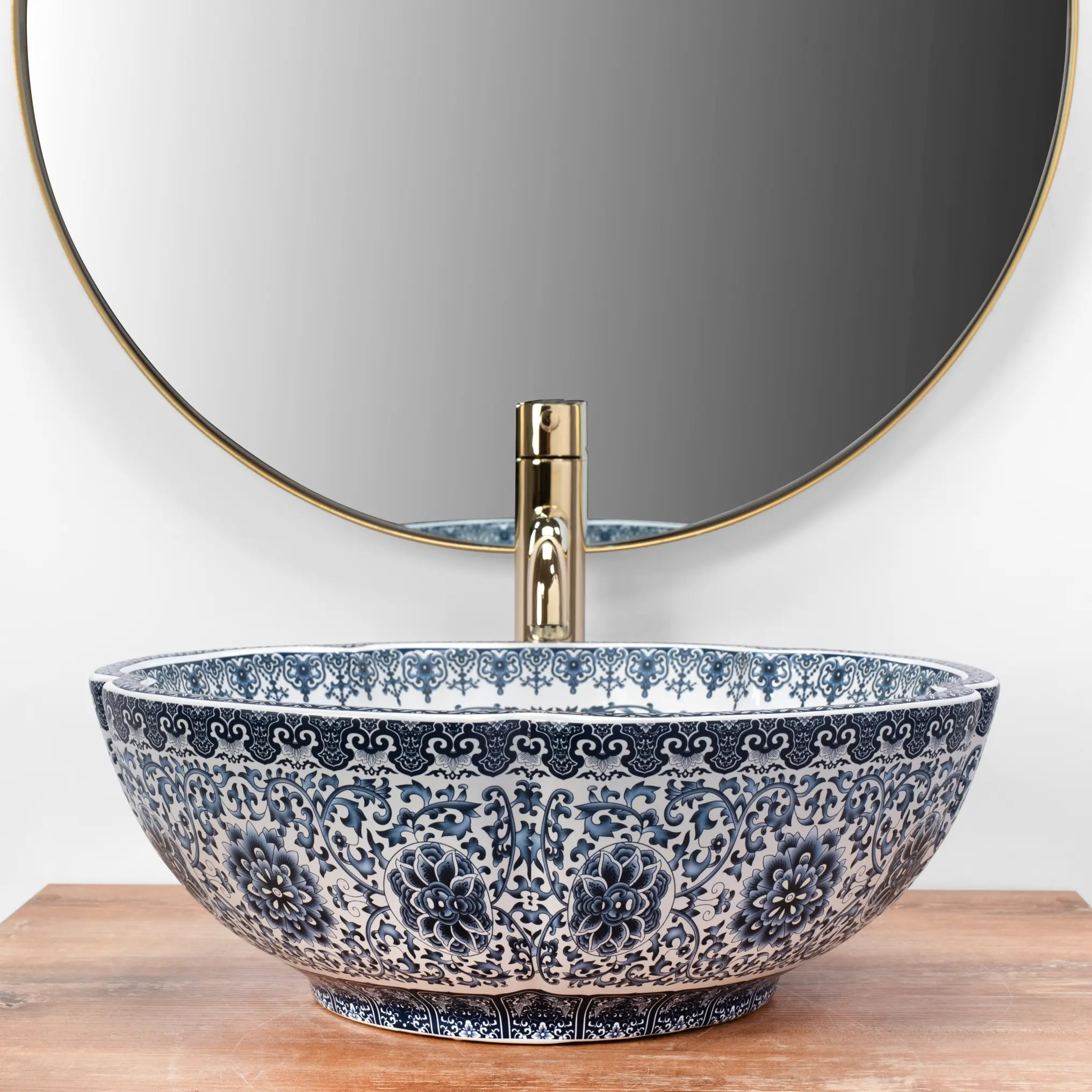Transformă zona de lavoar într-un element de design autentic cu acest lavoar ceramic rotund decorativ alb-albastru, realizat din ceramică sanitară de înaltă calitate și finisat mat pentru un aspect sofisticat și plăcut la atingere. Modelul ornamental inspirat din motive clasice oferă personalitate băii și creează un contrast elegant în amenajările moderne sau vintage reinterpretate.