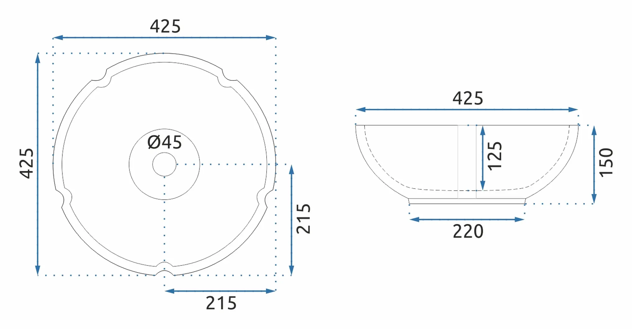 Forma rotundă oferă ergonomie optimă în utilizare și distribuție uniformă a apei, reducând stropirea în utilizarea zilnică. Dimensiunea de 425 x 425 mm permite integrarea ușoară pe majoritatea tipurilor de blat, fiind potrivit atât pentru băi rezidențiale, cât și pentru spații comerciale premium, hoteluri boutique sau pensiuni.