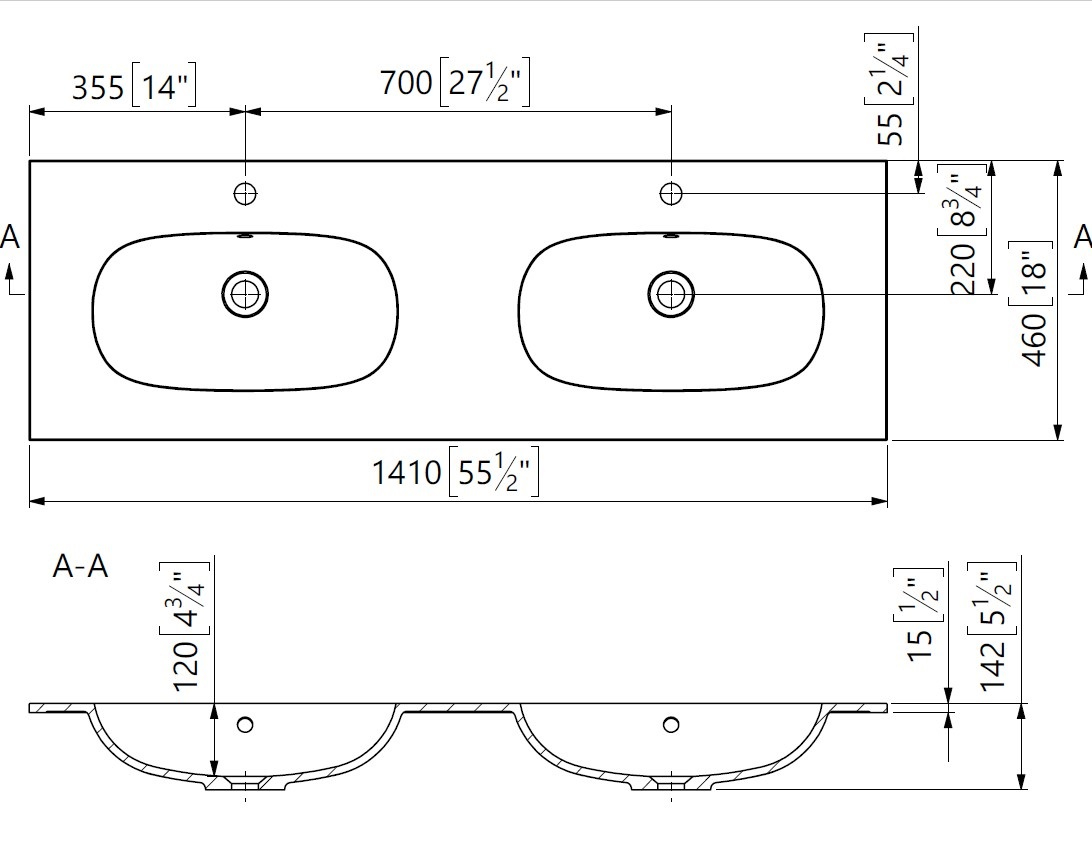 Dimensiunile de 1410 x 460 mm și înălțimea de 142 mm oferă un spațiu generos pentru utilizare confortabilă, fiind potrivite pentru mobilier de baie de dimensiuni medii sau mari. Lavoarul contribuie la crearea unui spațiu funcțional și elegant.