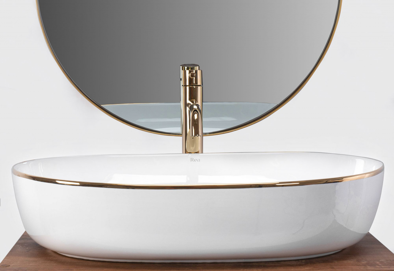 Lavoar premium din ceramică albă cu margine aurie, finisaj lucios. Ideal pentru băi elegante, amenajări moderne și spații luxury.