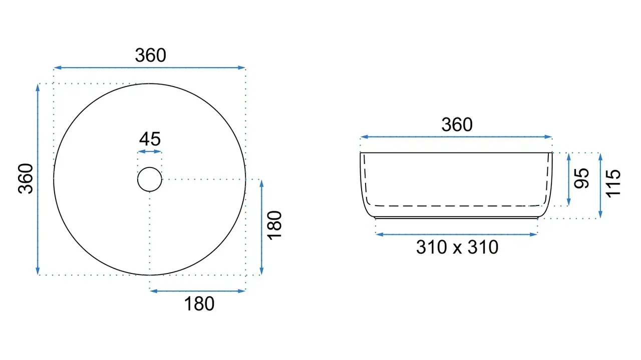 Dimensiuni: 360 × 360 × 115 mm (L × l × H), adâncimea cuvei fiind ~95–100 mm