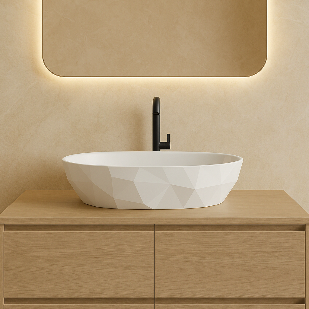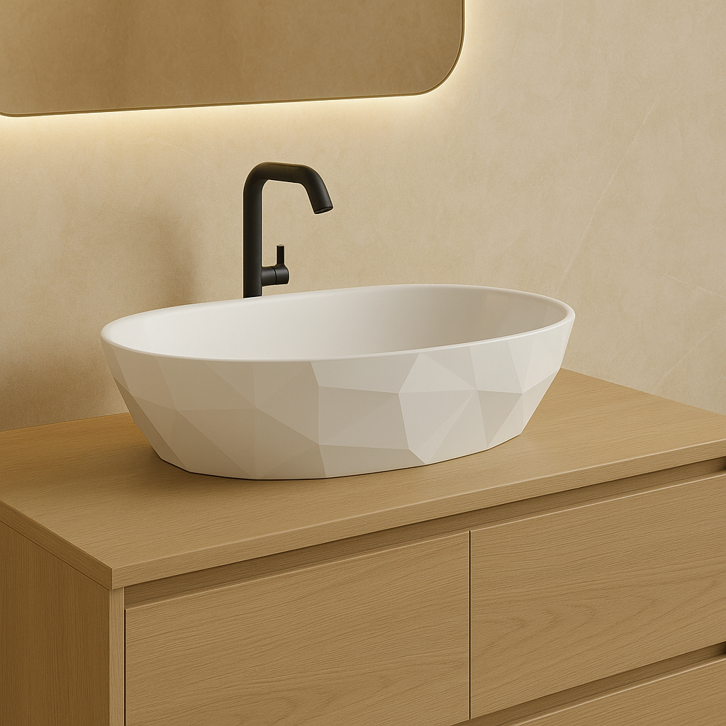 Adaugă un element sculptural băii tale cu lavoarul pe blat Foglia Armonia Slim, o piesă de design ce îmbină estetica avangardistă cu funcționalitatea modernă. Modelul impresionează prin finisajul 3D cu fațete geometrice inspirate din cristalografie, oferind un efect vizual inedit, sofisticat și elegant.