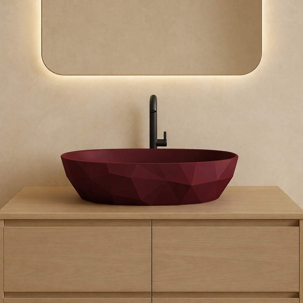 Fabricat din compozit mineral burgundy mat, lavoarul este durabil, rezistent la zgârieturi și temperaturi ridicate, iar suprafața sa netedă asigură o curățare ușoară și o igienă impecabilă. Este soluția ideală pentru băi premium, spa-uri sau interioare contemporane unde designul contează.