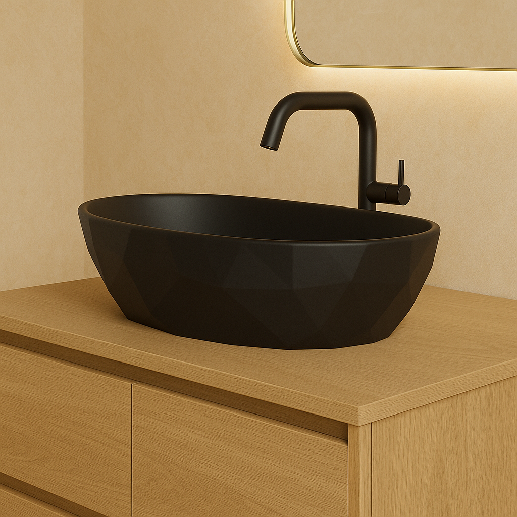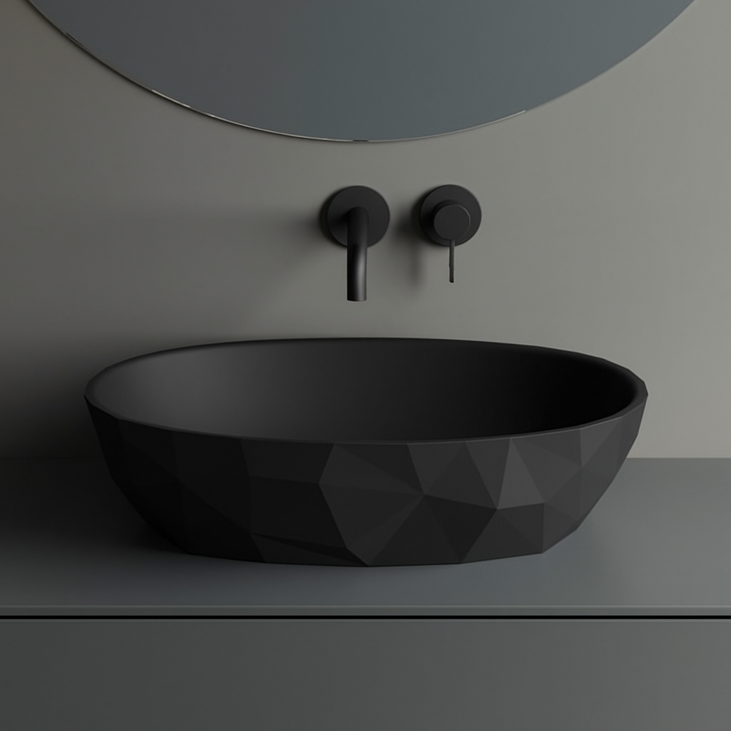 Fabricat din compozit mineral negru mat, lavoarul este durabil, rezistent la zgârieturi și temperaturi ridicate, iar suprafața sa netedă asigură o curățare ușoară și o igienă impecabilă. Este soluția ideală pentru băi premium, spa-uri sau interioare contemporane unde designul contează.