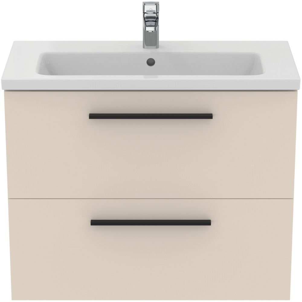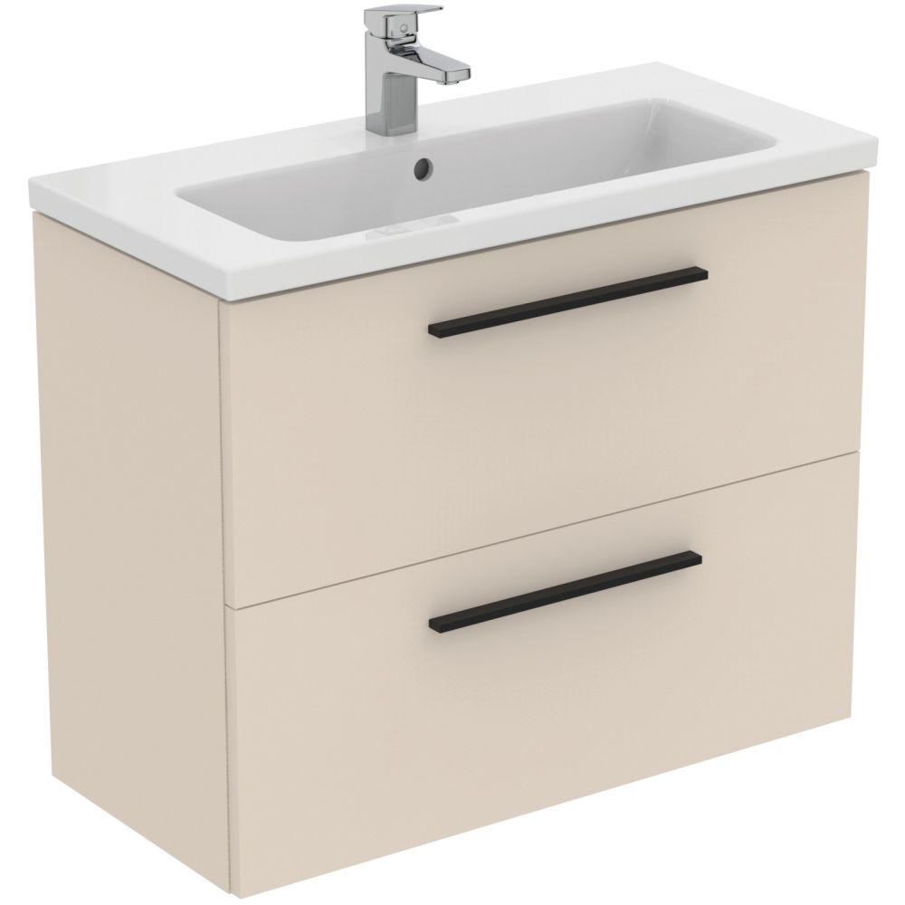 Set dulap baie suspendat bej nisipiu Ideal Standard i.Life S cu lavoar inclus 81 cm alb si maner negru