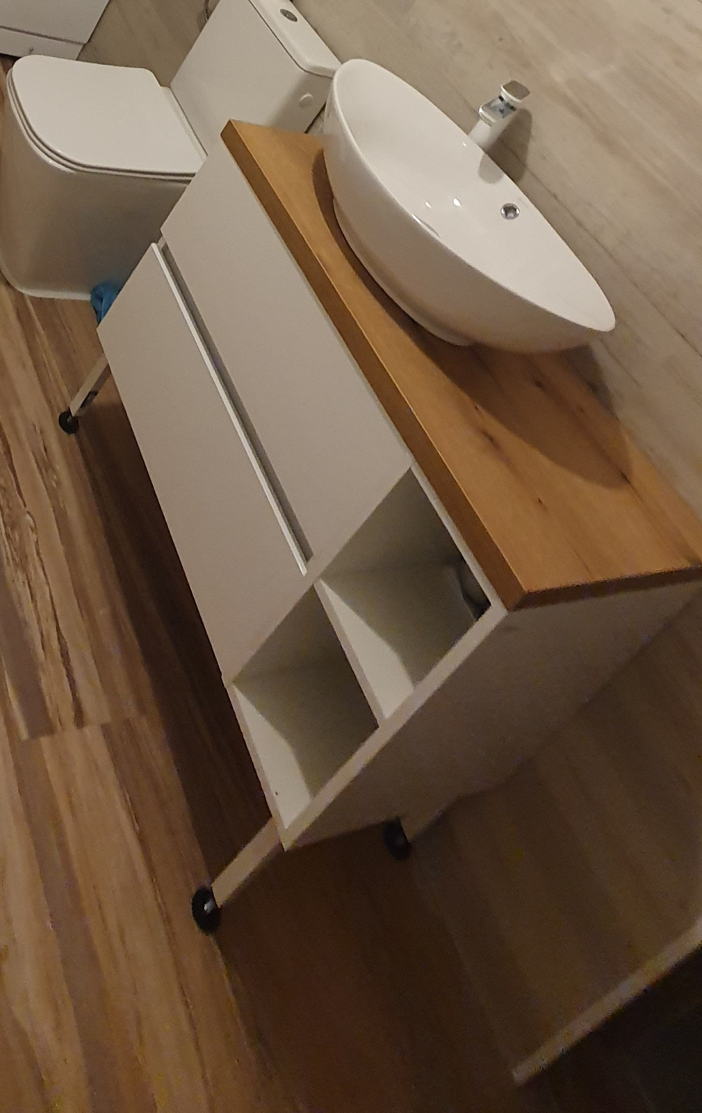- Blat durabil și spațios: Blatul este realizat din materiale de înaltă calitate, rezistente la umiditate și uzură, asigurând o durată de viață îndelungată. Suprafața sa netedă și spațioasă este ideală pentru a susține lavoarul pe blat și pentru a crea un punct focal modern în baie.