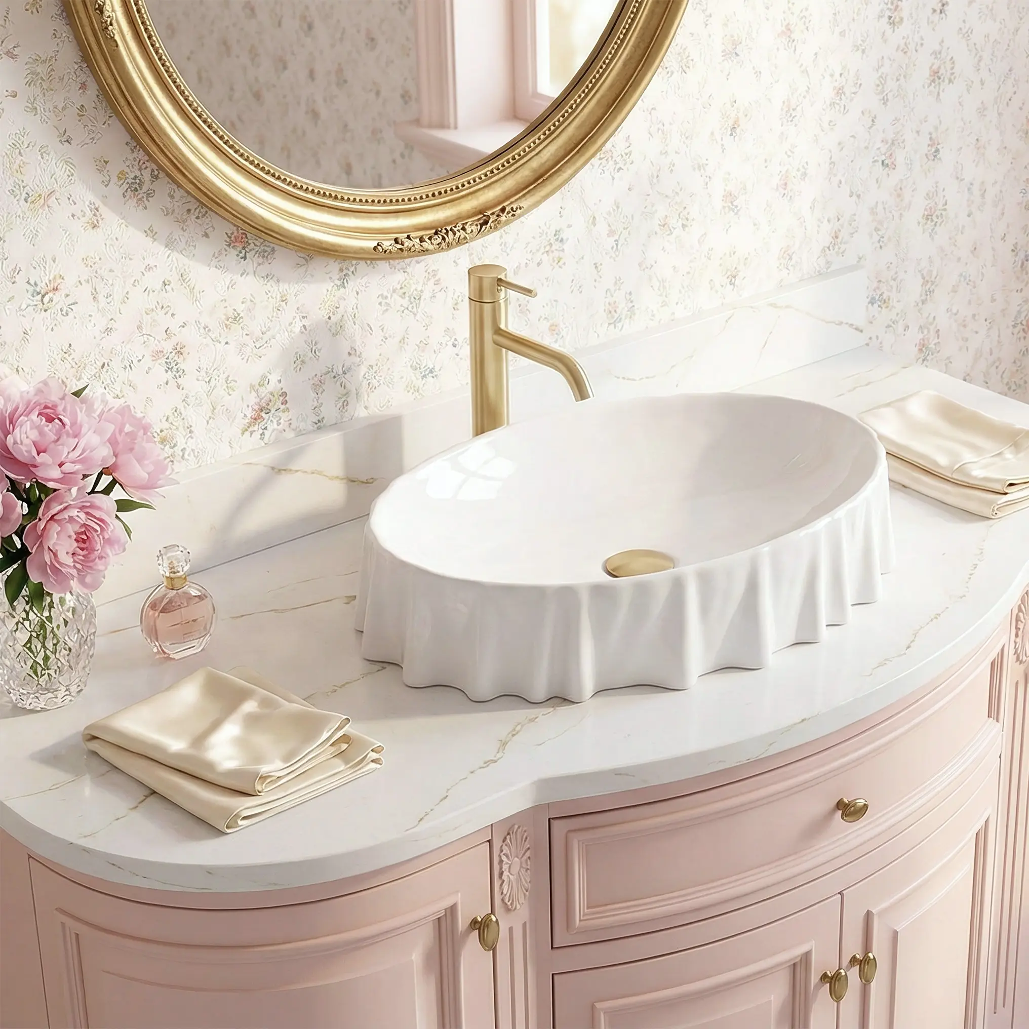 Forma ovală, ușor asimetrică, împreună cu marginile fluide și ondulate, creează un design sculptural, ideal pentru băi premium sau concepte de tip spa. Cuva generoasă și adâncimea optimă contribuie la confortul utilizării zilnice, prevenind stropirea și facilitând scurgerea eficientă a apei.