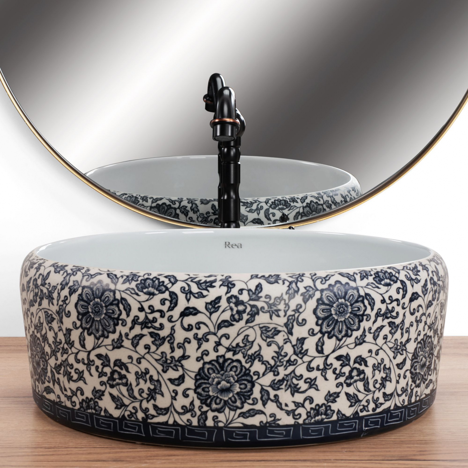 Lavoarul pe blat REA Florisa este o piesă decorativă deosebită, inspirată din motive clasice alb/albastru, care adaugă personalitate și rafinament oricărei băi. Designul său ornamental transformă zona de lavoar într-un element central de design, potrivit pentru amenajări elegante, vintage, clasice sau eclectic-chic.