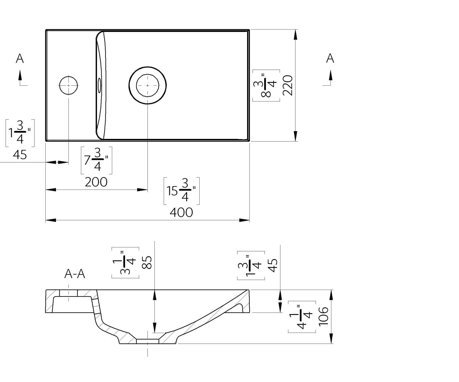 Dimensiunile de 400 x 220 mm și înălțimea de 106 mm îl fac ideal pentru băi mici, grupuri sanitare sau zone unde este necesar un lavoar compact și funcțional.