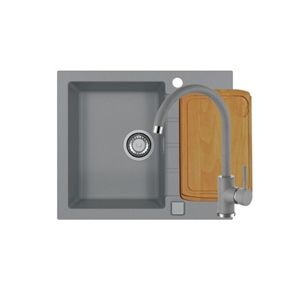 Setul contine chiuveta bucatarie din compozit Cadit 10, baterie bucatarie Alveus Kati si tocator lemn, gri.