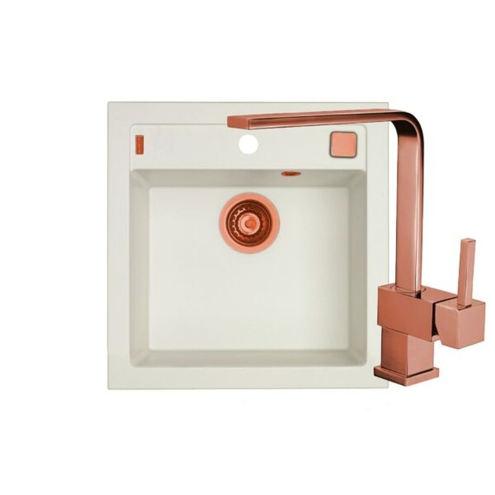 Setul contine chiuveta bucatarie din compozit alba Formic 20 si baterie bucatarie cupru Alveus Laguna Monarch.