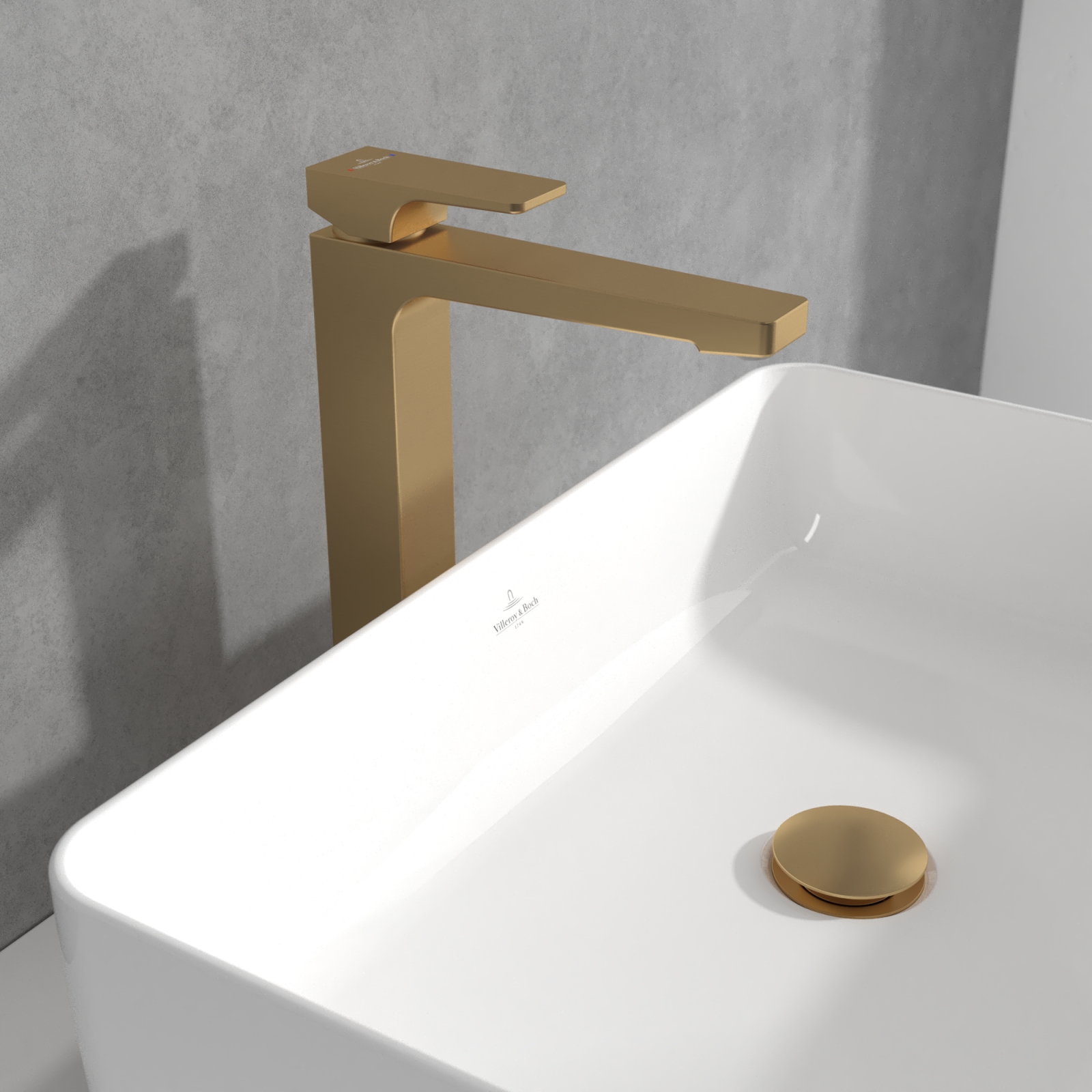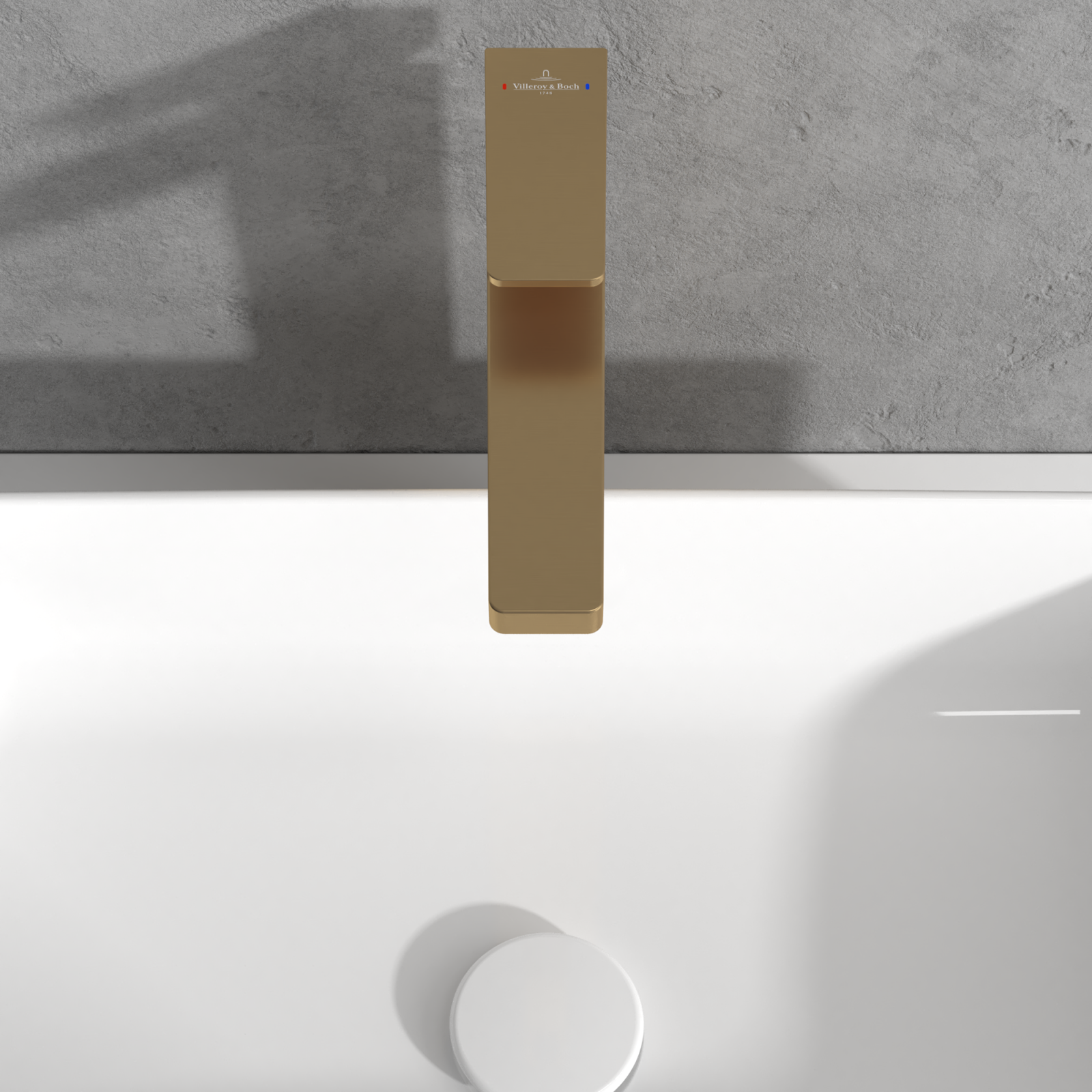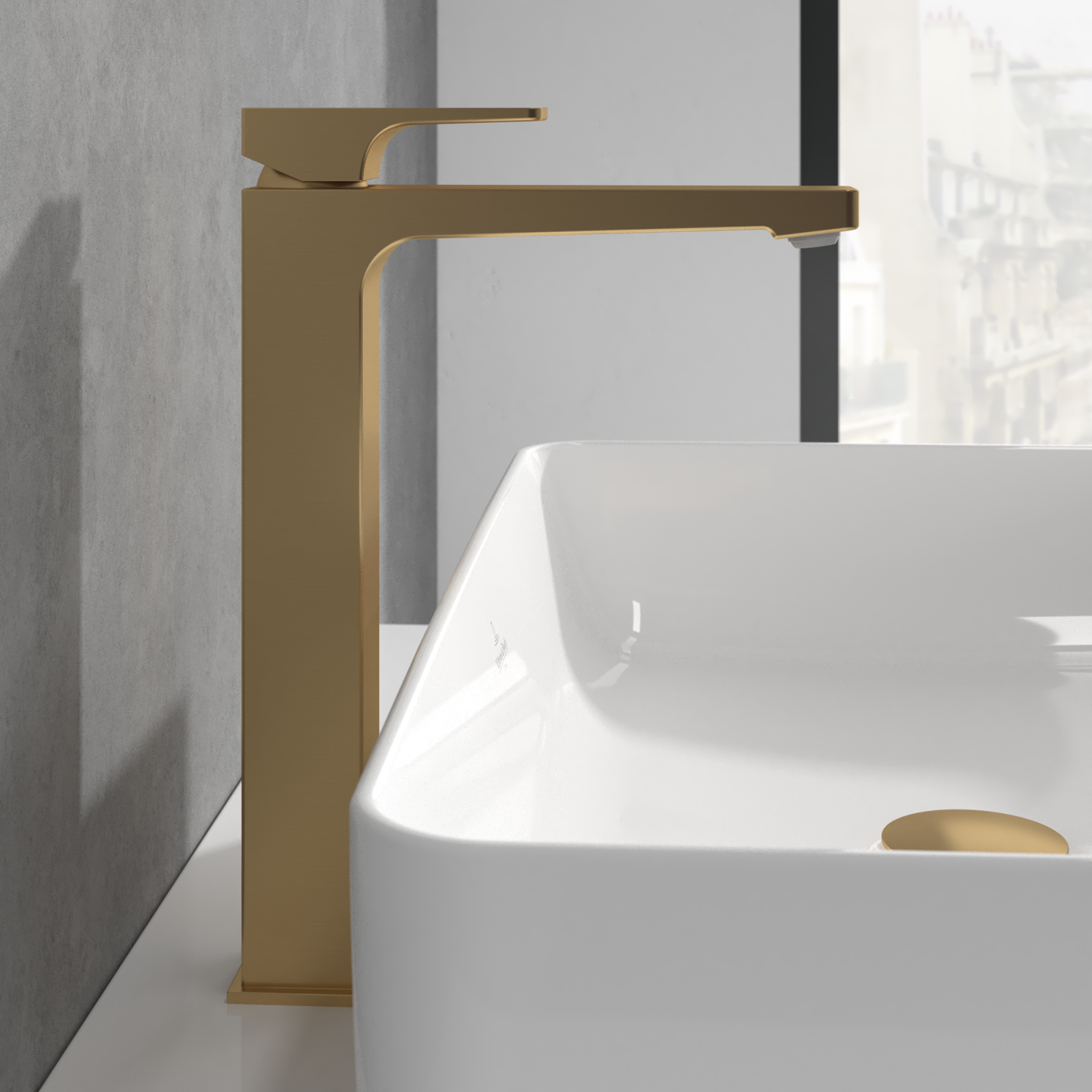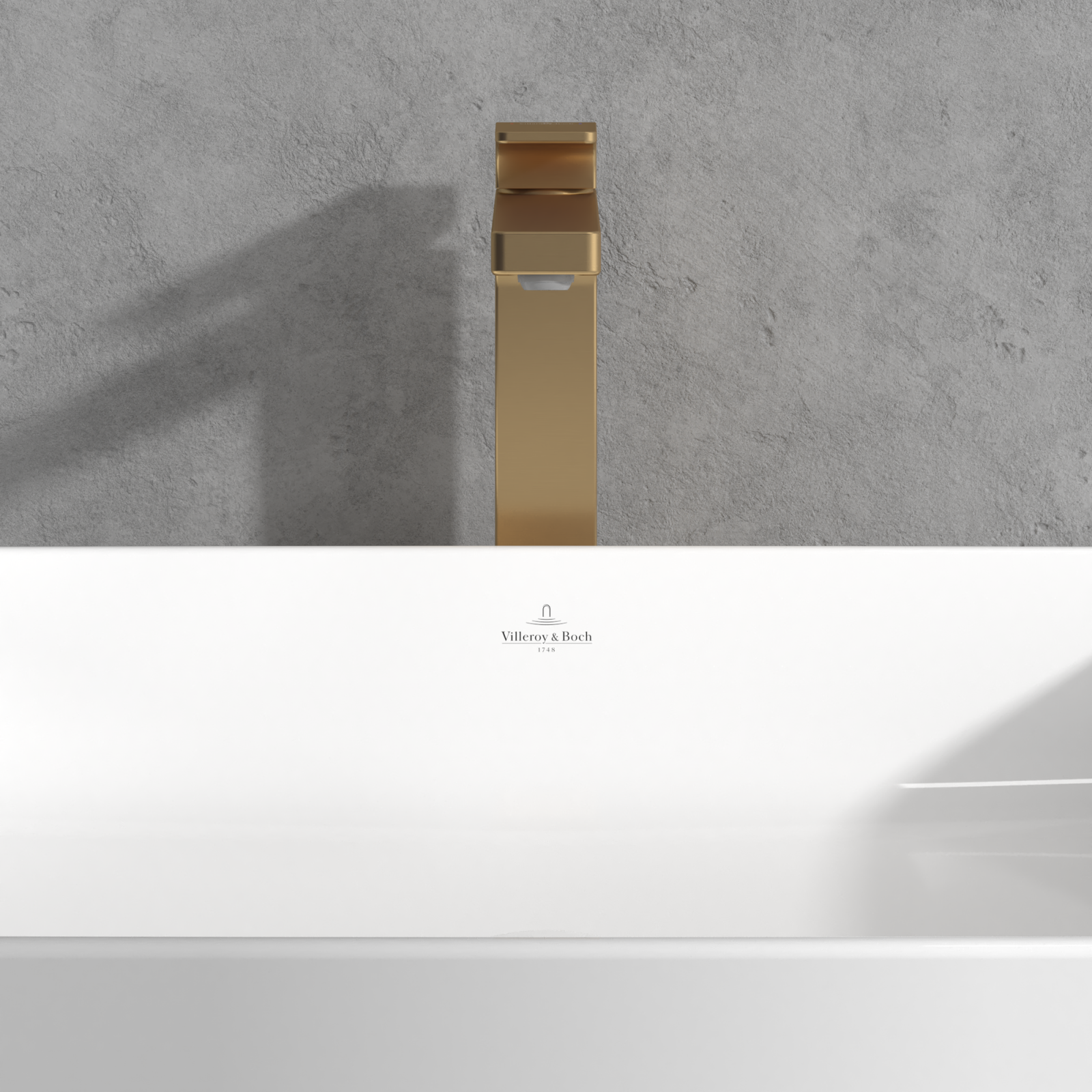 Bateria înaltă pentru lavoar din colecția Architectura Square de la Villeroy & Boch redefinește eleganța în baie printr-un design geometric clar și un finisaj brushed gold sofisticat. Este alegerea ideală pentru lavoare tip bol montate pe blat, unde proporțiile și estetica joacă un rol esențial.