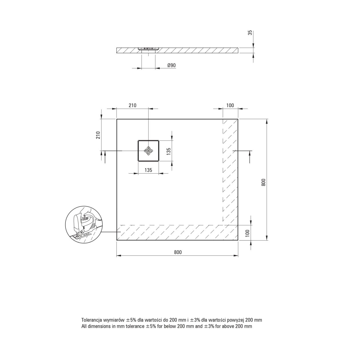 Dimensiuni: 800 x 800 x 35 mm.