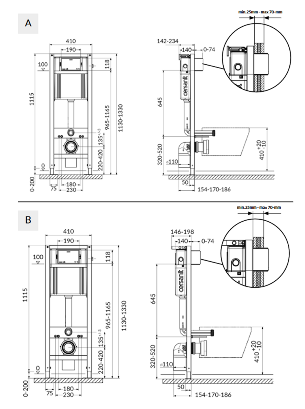Montaj flexibil: Cadru incastrat cu adâncime redusă (15-20 cm) şi înălţime reglabilă – potrivit pentru băi renovate sau spaţii cu perete subţire.