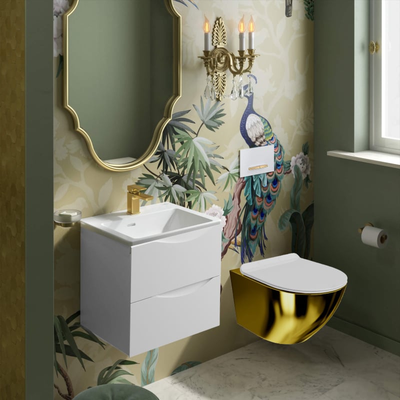 Finisajul auriu-alb adaugă un accent premium: exterior auriu lucios, capac alb-mat, o alegere perfectă pentru amenajări de tip boutique, hotel sau baie de lux. Rimless înseamnă lipsa muchiilor interioare unde se pot acumula impurităţi, ceea ce facilitează întreţinerea şi sporeşte durabilitatea.