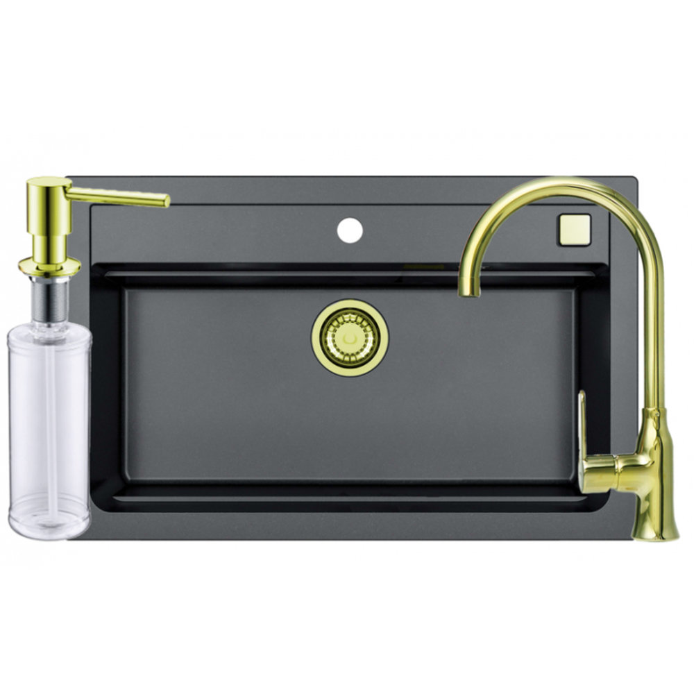 Pachetul contine chiuveta bucatarie compozit Alveus Atrox 40 neagra, baterie bucatarie aurie Alveus Lola Monarch, sifon auriu si dozator sapun lichid auriu.