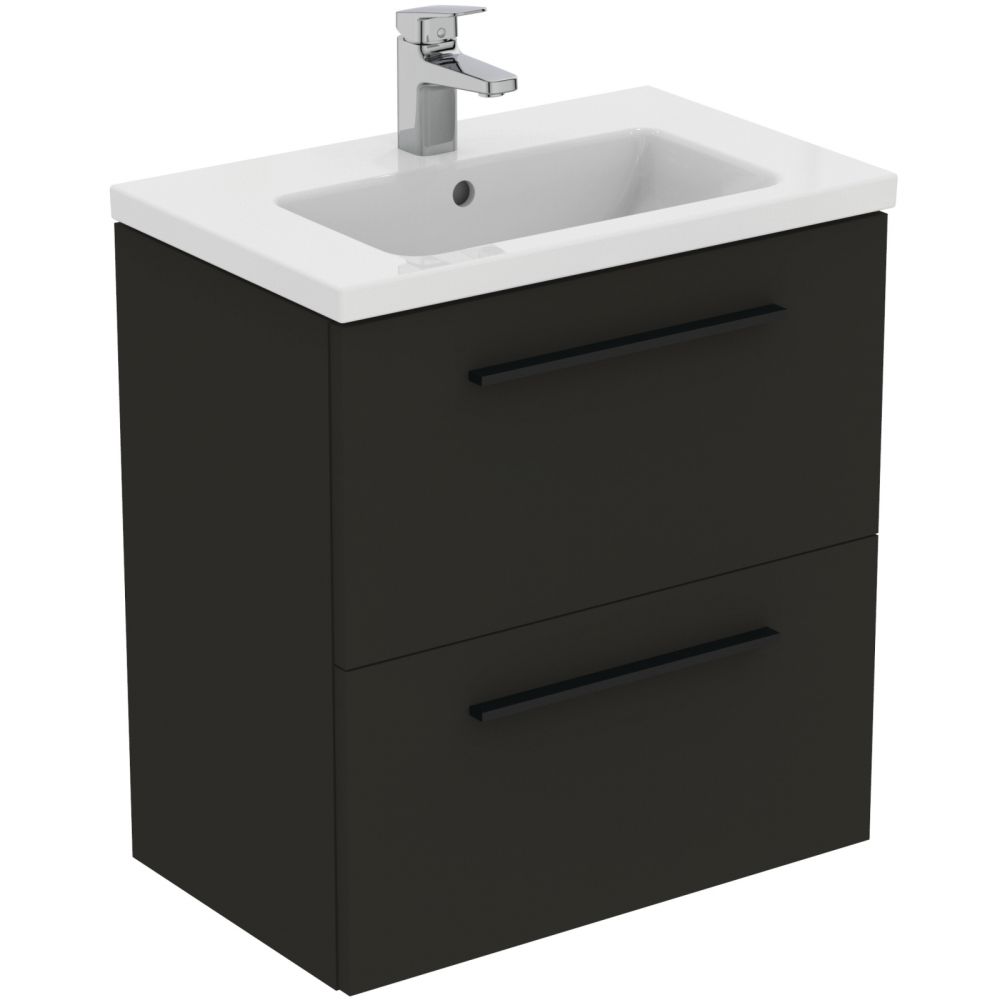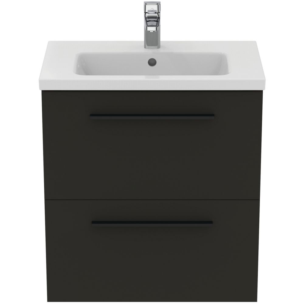 Set dulap baie suspendat gri carbon Ideal Standard i.Life S cu lavoar inclus 61 cm alb si maner negru