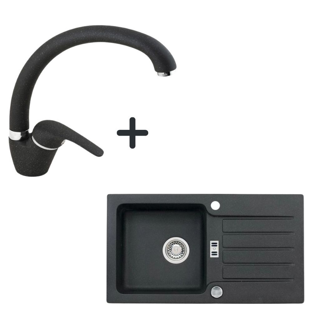 Set chiuveta bucatarie dreptunghiulara neagra Niagara cu ventil pop-up inclus plus baterie neagra Alveus GM 230
