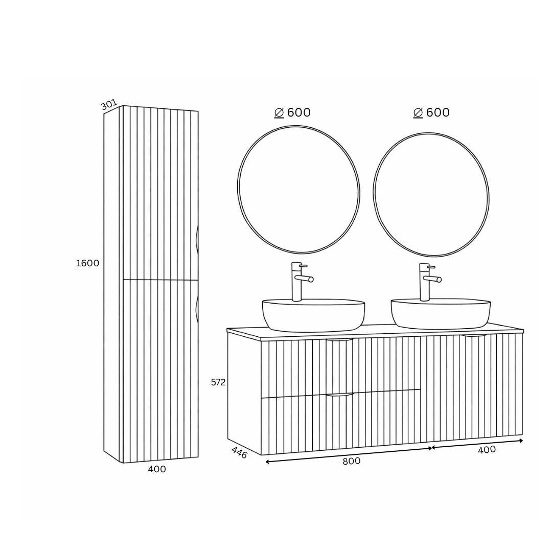 - Dimensiuni totale: 1600 x 400 x 301,5 mm (înalțime x lățime x adâncime).