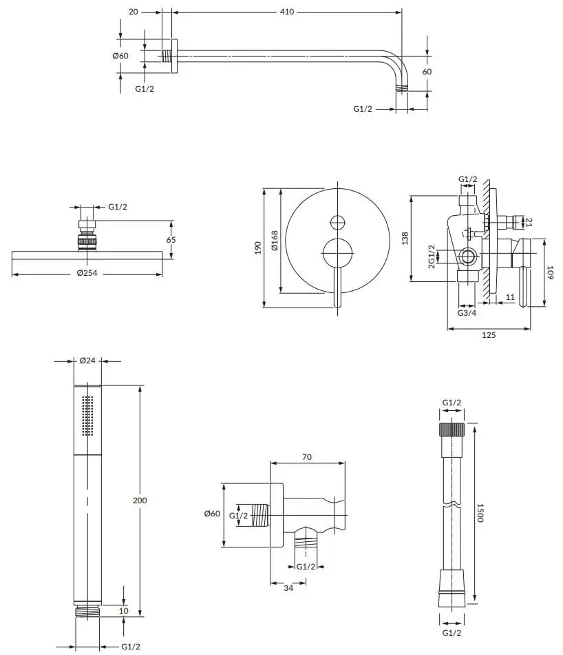 Cap de duș tip „pălărie” – diametru de 25 cm, fabricat din alamă, echipat cu tehnologia EasyClean (duze din silicon pentru curățare ușoară) și Anti-Scale (previne stagnarea apei). Respectă o proiecție de 41 cm din perete.