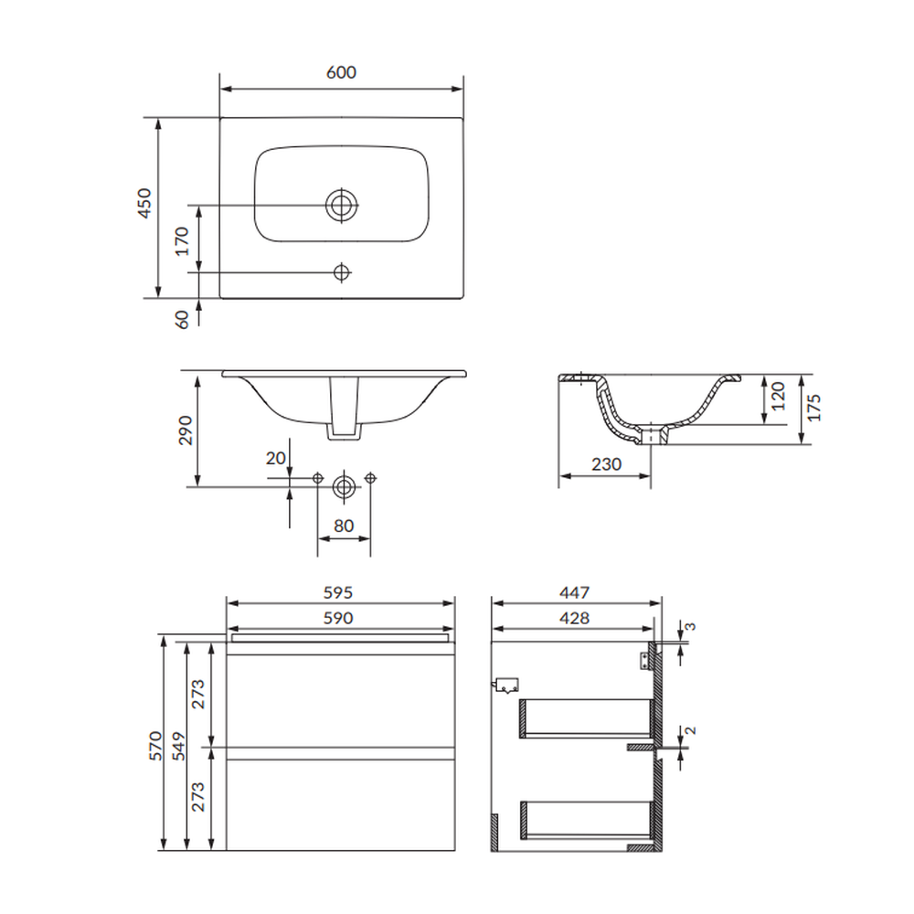 Set dulap baie suspendat 2 sertare cu lavoar Cersanit Moduo inclus, 60 cm, antracit mat, B893, montat