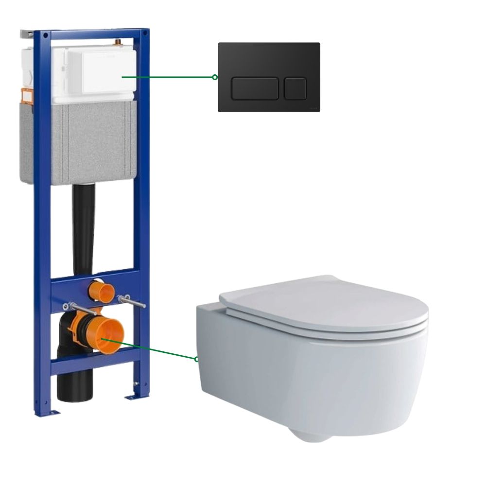 Setul se compune dintr-un vas WC suspendat rotund, Direct Flush si un capac cu inchidere lenta (soft close) si demontare rapida (quick release);