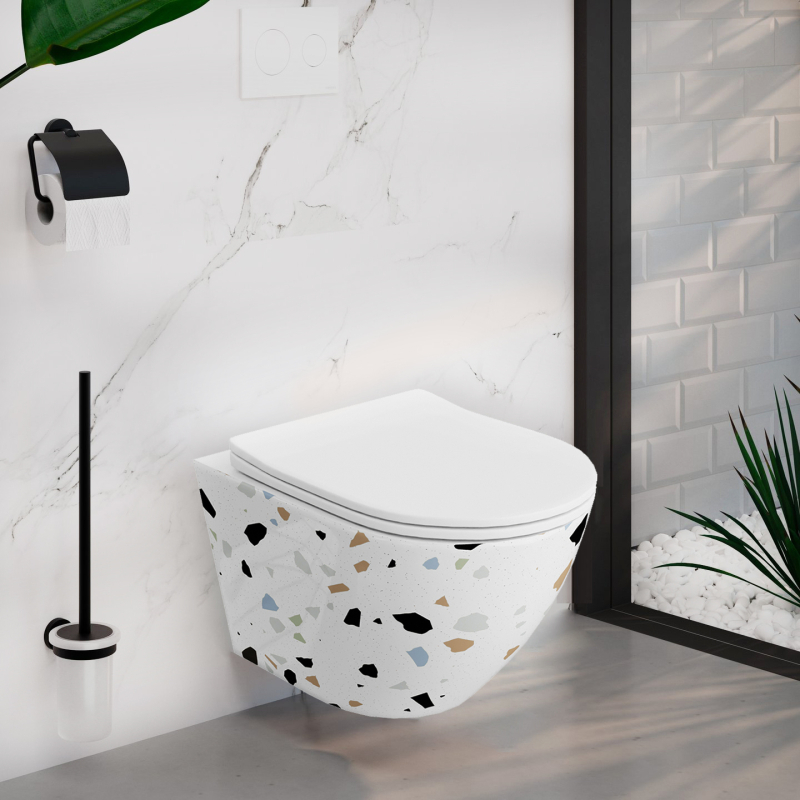 Finisajul alb mozaic creează o textură vizuală deosebită, adăugând un accent de design rafinat în ambientul băii. Capac inclus (cu mecanism Soft-Close şi sistem Quick Release) asigură o utilizare silenţioasă şi întreţinere rapidă.